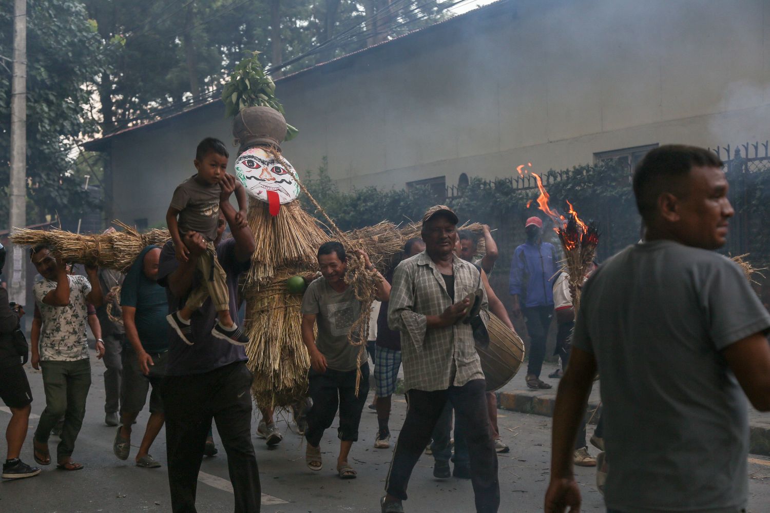 民众抬着稻草扎制的恶魔“刚塔卡尔纳”前往巴克塔普尔古城。