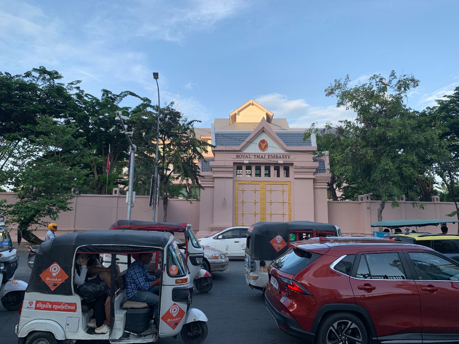 柬埔寨外交部发言人宗松里24日对媒体表示,柬埔寨决定将与泰国的外交关系降至最低级别,并召回驻曼谷外交人员。图为7月24日在柬埔寨首都金边拍摄的泰国驻柬埔寨大使馆。(图片来源:本文图片均自新华社)