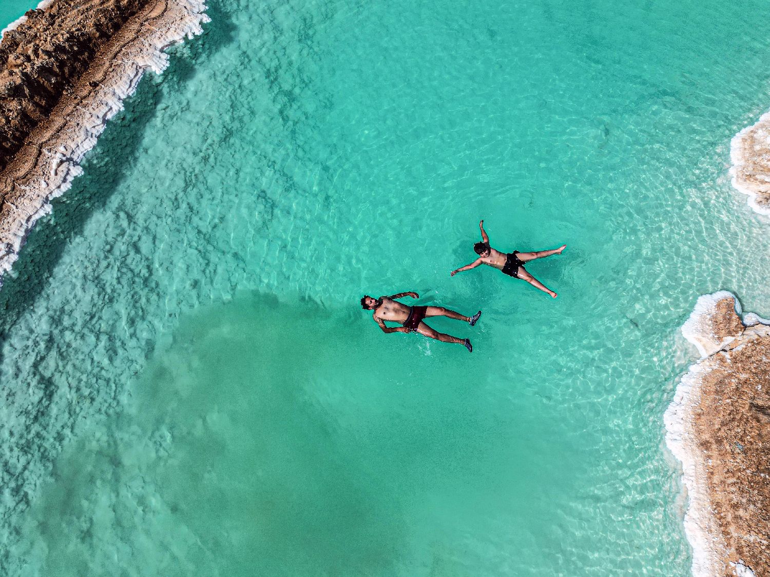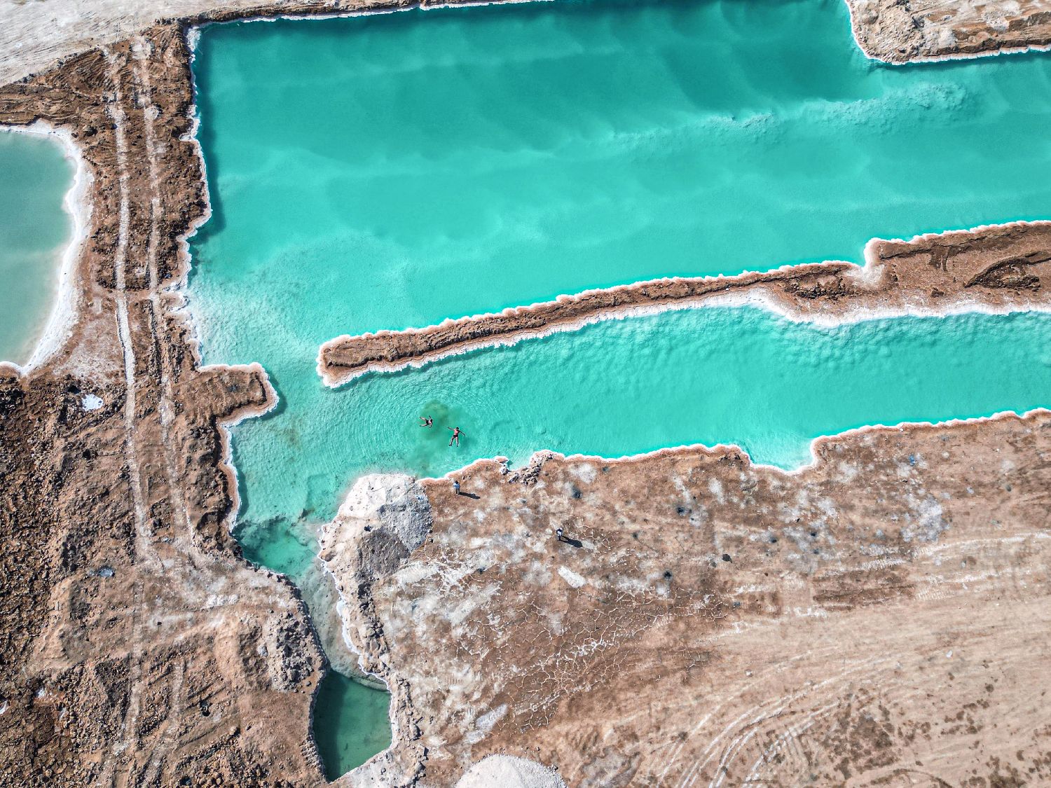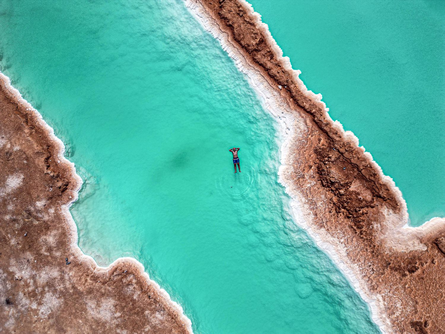 7月28日,游客在埃及锡瓦绿洲的一处盐湖玩耍(无人机照片)。