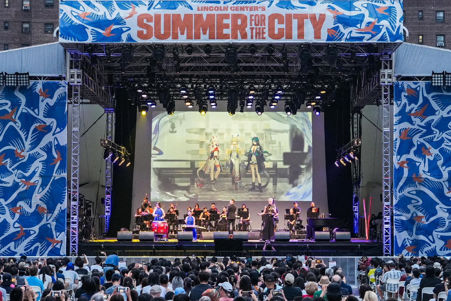 7月26日,人们在美国纽约林肯艺术中心“上海日”活动上观看《明日方舟》露天音乐会。
