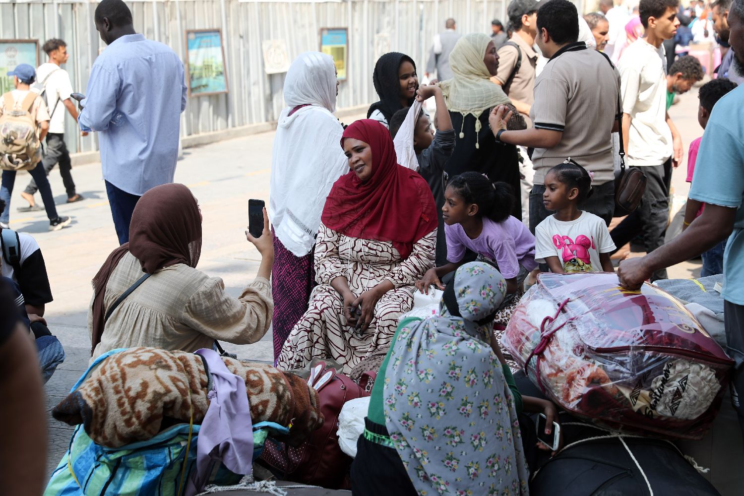7月28日,在埃及开罗的拉美西斯火车站,苏丹难民在站外等待乘车。(图片来源:新华社)