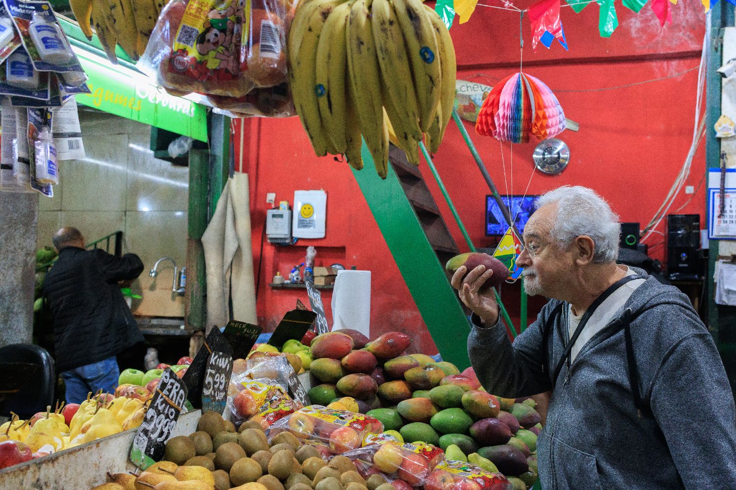 7月29日,一名男子在巴西里约热内卢一处水果摊挑选水果。