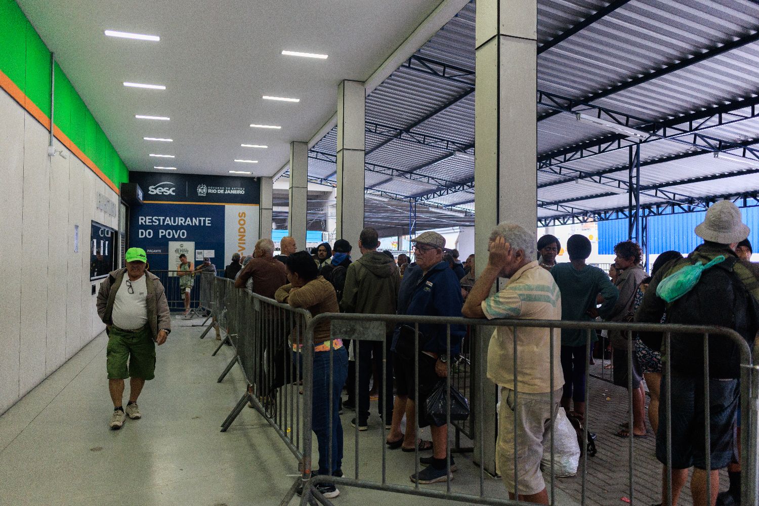 7月29日,在巴西里约热内卢一处政府运营的平价供餐点,民众在入口处排队等候领取午餐。