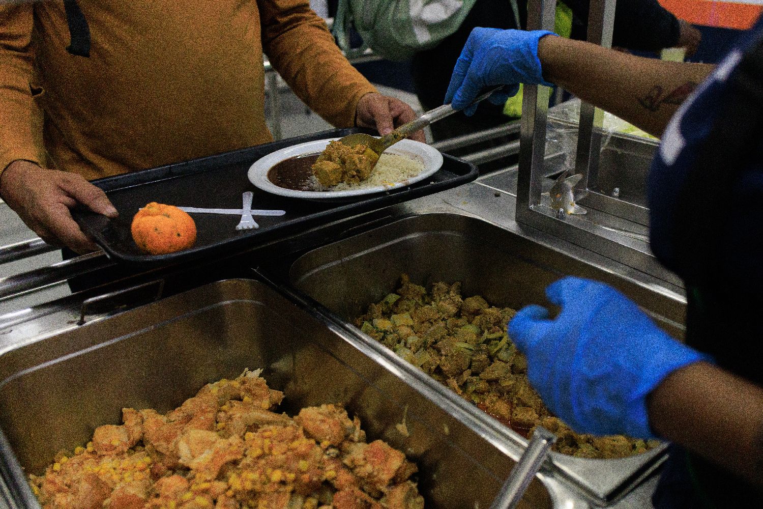 7月29日,在巴西里约热内卢一处政府运营的平价供餐点,工作人员向民众分发饭菜。