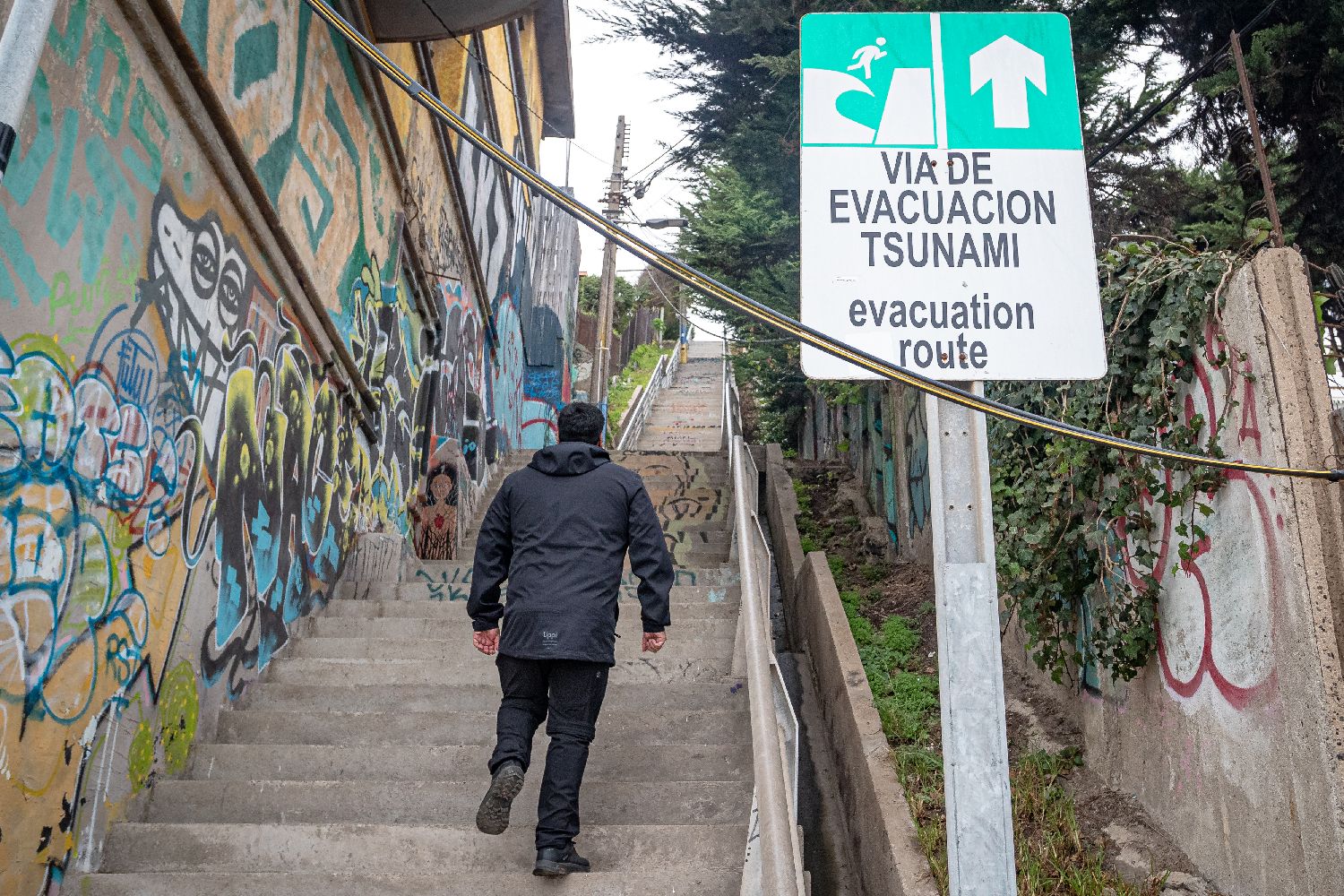 7月30日,在智利瓦尔帕莱索大区康孔市,一名男子沿着“海啸疏散路线”撤离。