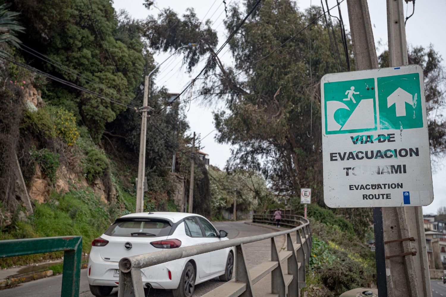 7月30日,在智利瓦尔帕莱索大区康孔市,一辆汽车沿着“海啸疏散路线”驶向安全地带。