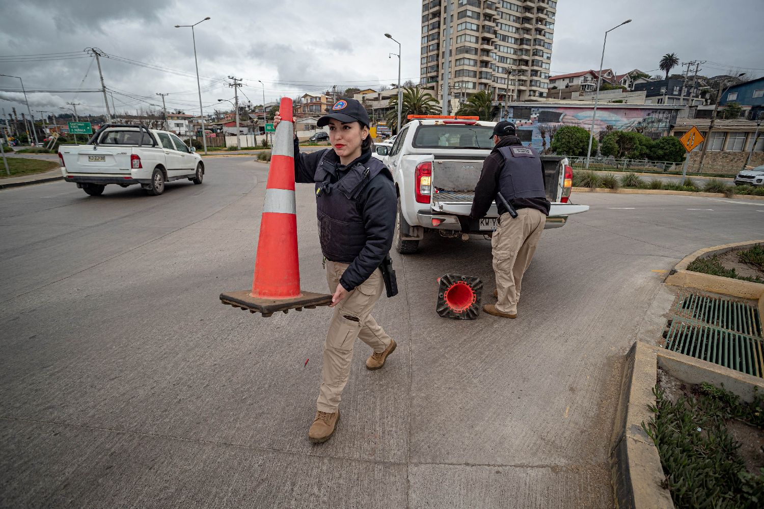 7月30日,在智利瓦尔帕莱索大区康孔市,警方设置道路疏散引导标志。