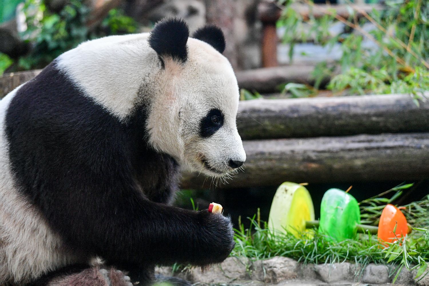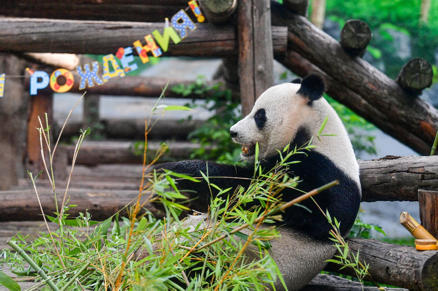 7月31日,旅俄大熊猫“如意”在生日庆祝活动上享用竹子。