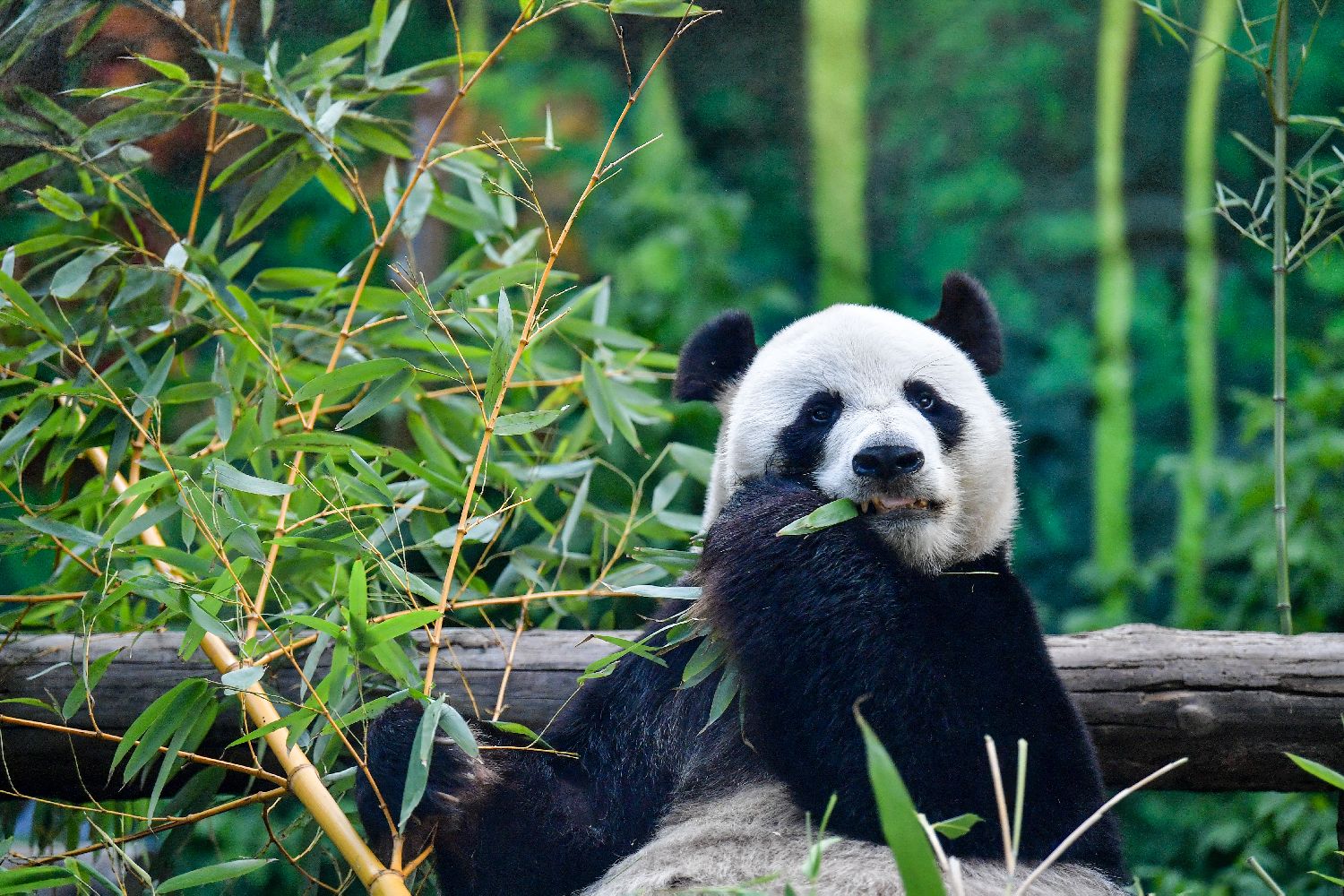 7月31日,在俄罗斯莫斯科动物园,旅俄大熊猫“如意”在生日庆祝活动上享用竹子。