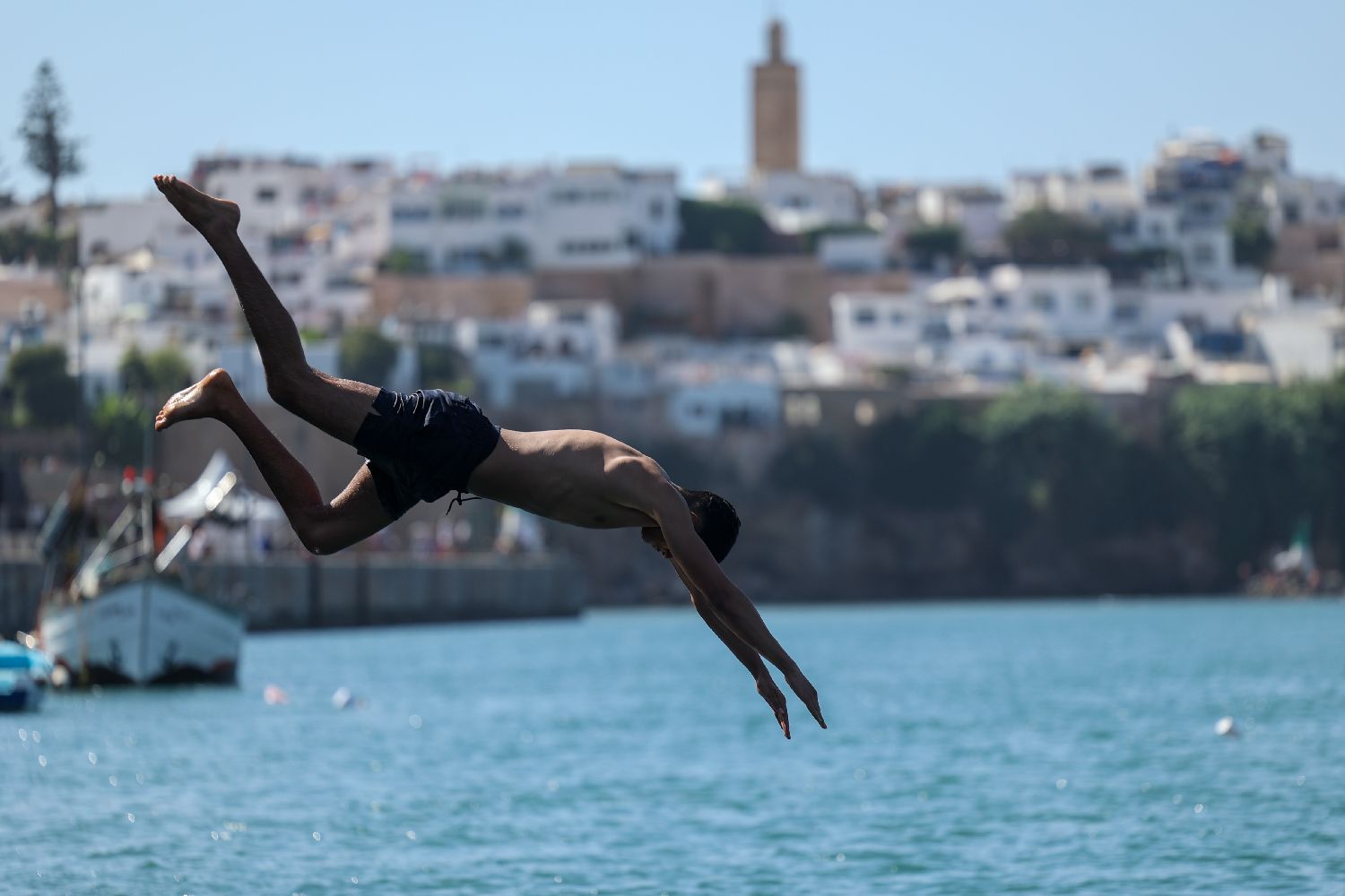 7月30日,在摩洛哥首都拉巴特,一名男子跳向布赖格赖格河纳凉。