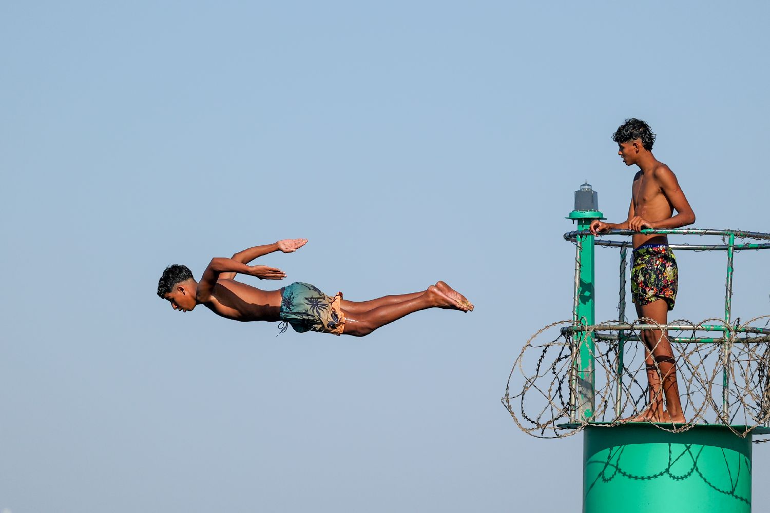 7月30日,在摩洛哥首都拉巴特,一名青年跳向布赖格赖格河纳凉。