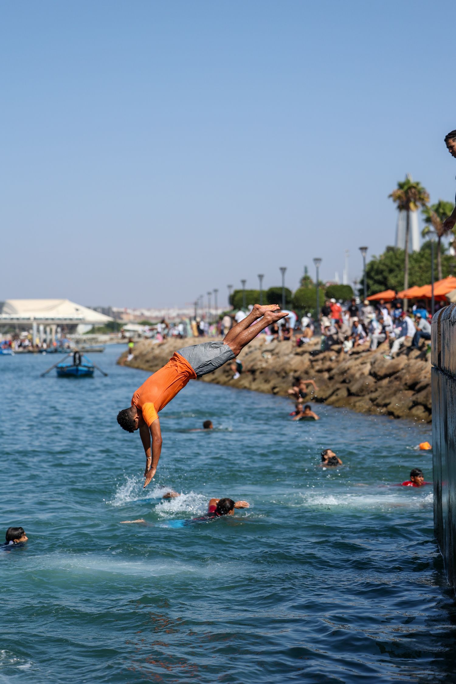 7月30日,在摩洛哥首都拉巴特,民众在海滩上消暑,民众跳向布赖格赖格河纳凉。