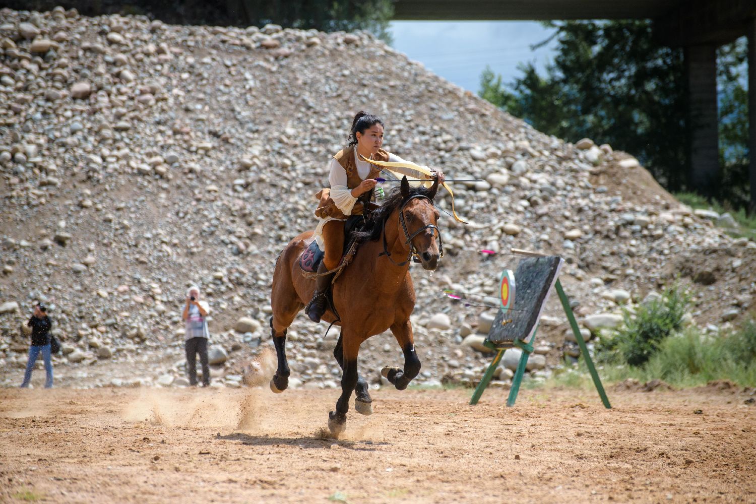 8月2日,一名女子在吉尔吉斯斯坦伊塞克湖南岸举行的民俗艺术节上展示骑马射箭。