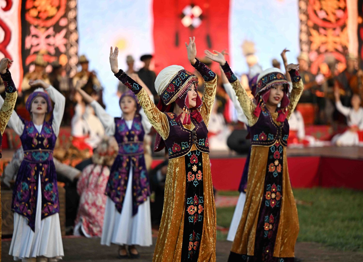 8月1日,在吉尔吉斯斯坦乔尔蓬阿塔市,演员在国际传统文化音乐艺术节上表演。
