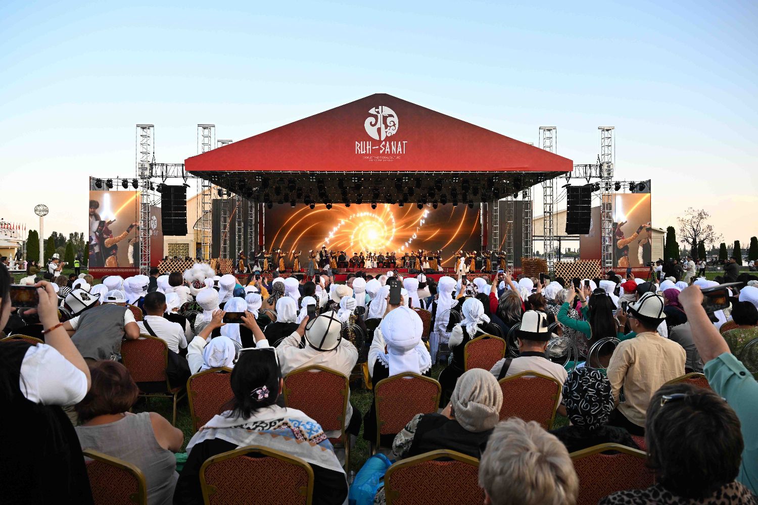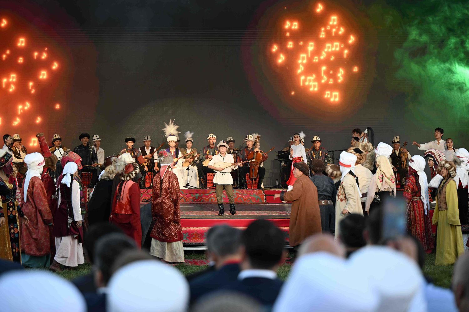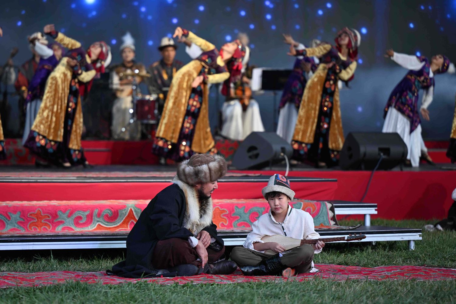 8月1日在吉尔吉斯斯坦乔尔蓬阿塔市拍摄的国际传统文化音乐艺术节现场。