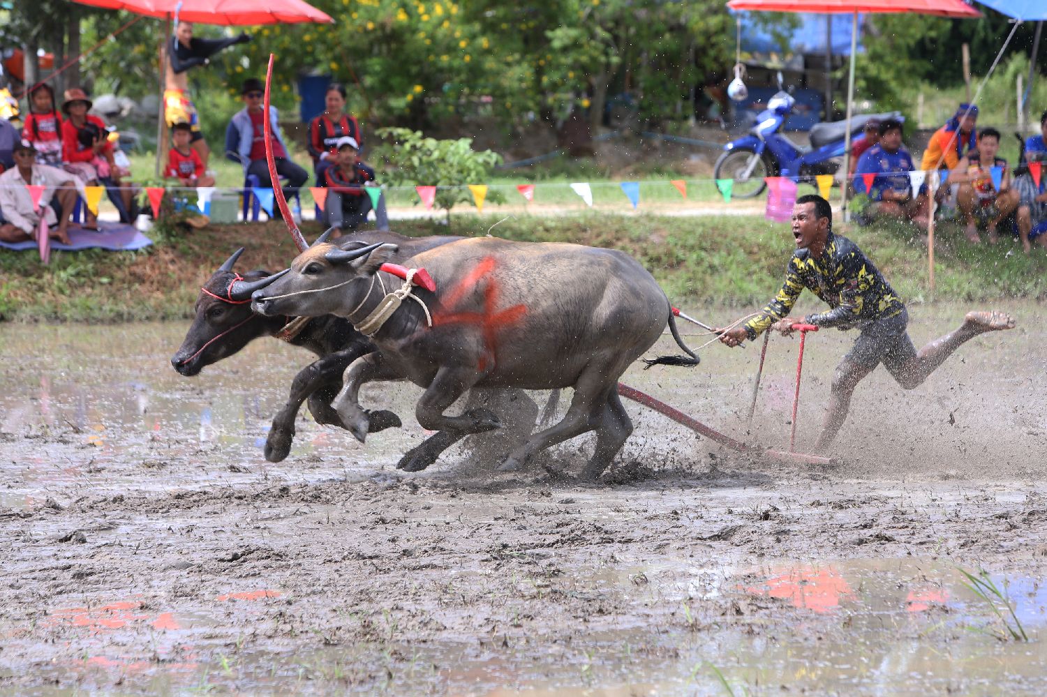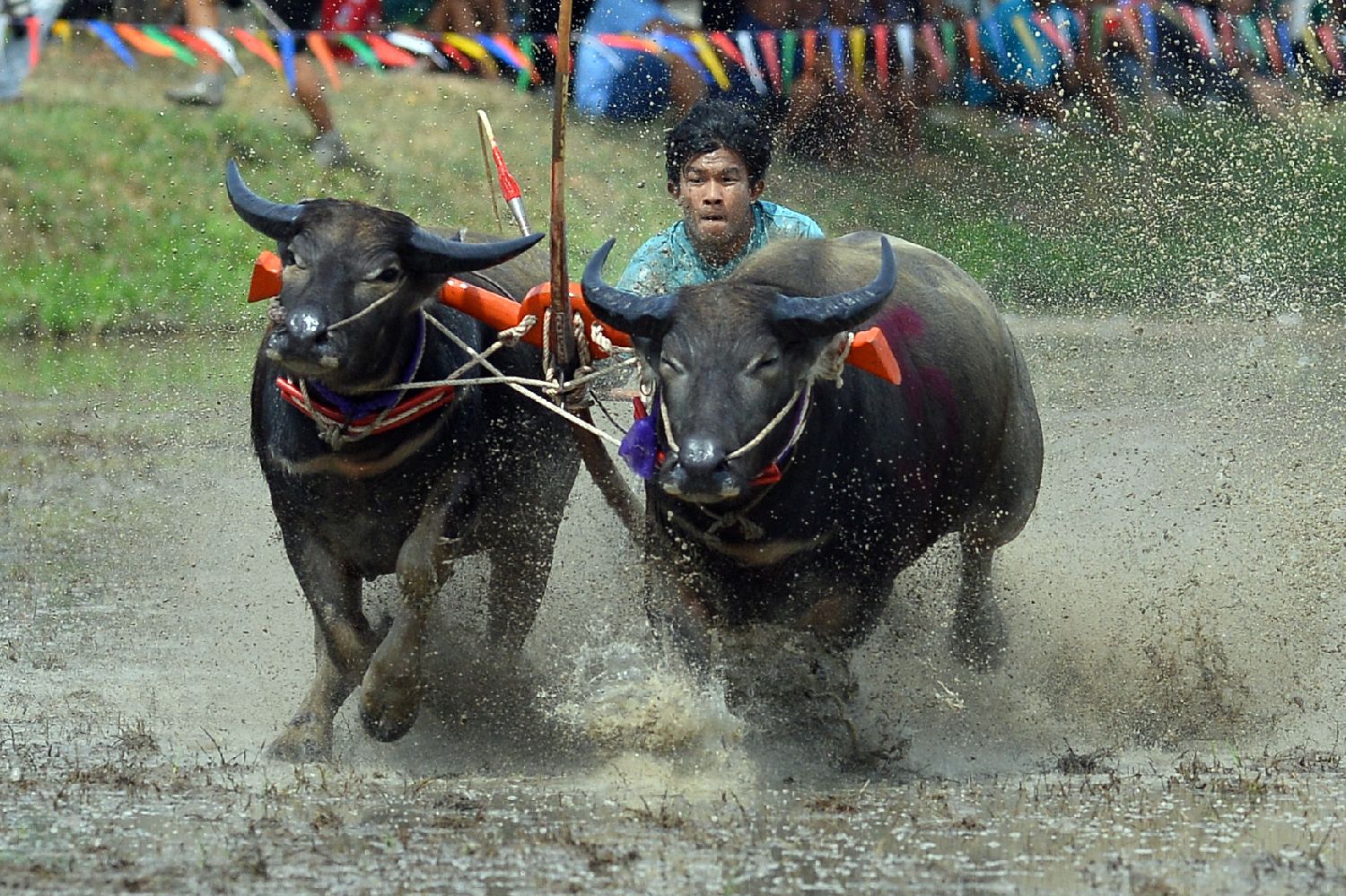 8月3日,参赛者在泰国春武里府参加赛牛活动。(图片来源:本文图片均据新华社)