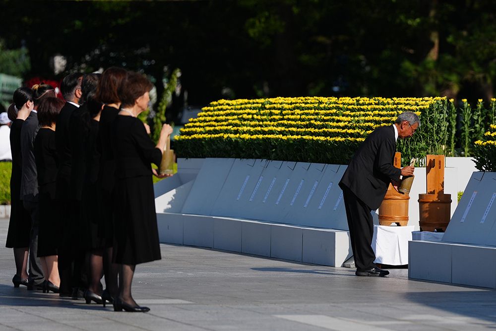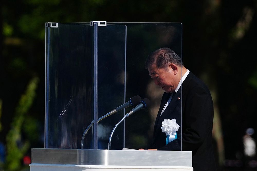 8月6日,日本首相石破茂在日本广岛举行的遭原子弹轰炸80周年纪念仪式上致辞。(图片来源:本文图片均据新华社)