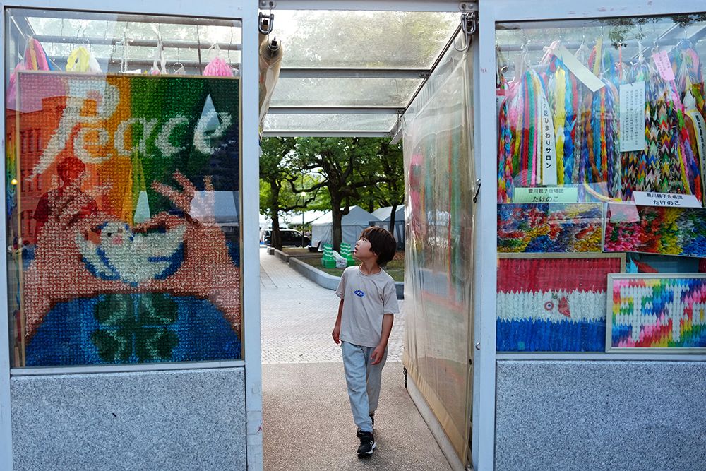 在日本广岛和平纪念公园,一名小朋友经过展出的祈愿和平的千纸鹤叠串。