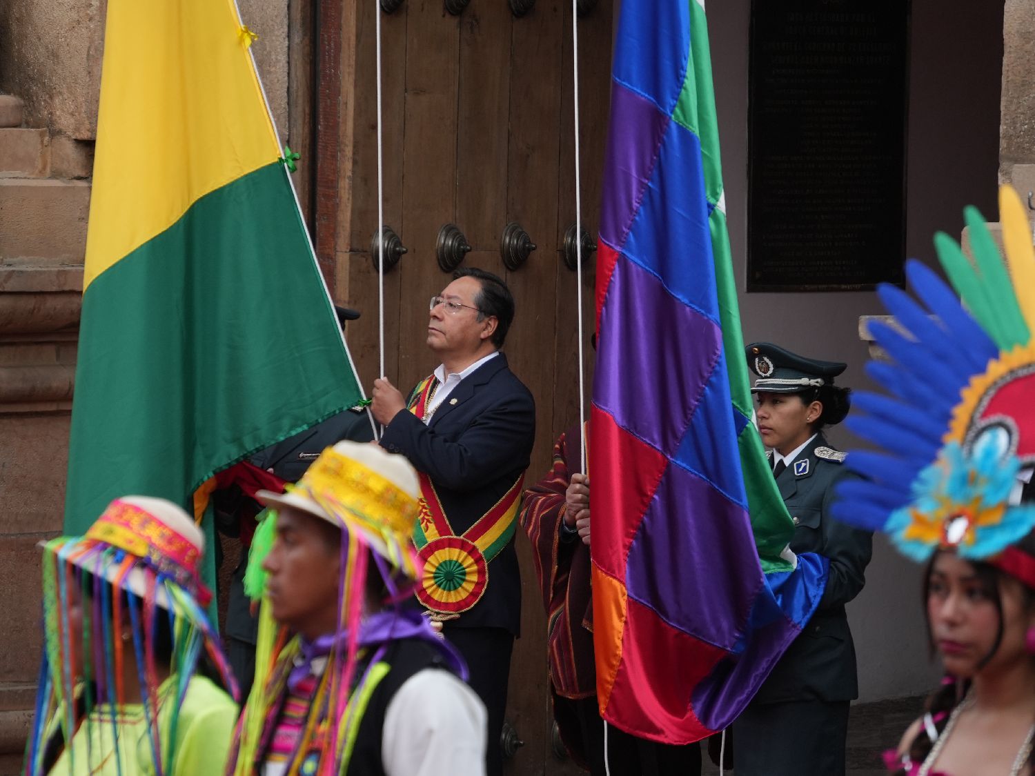 8月6日,玻利维亚总统阿尔塞(后左)在苏克雷参加升旗仪式,庆祝该国独立200周年。(图片来源:新华社)