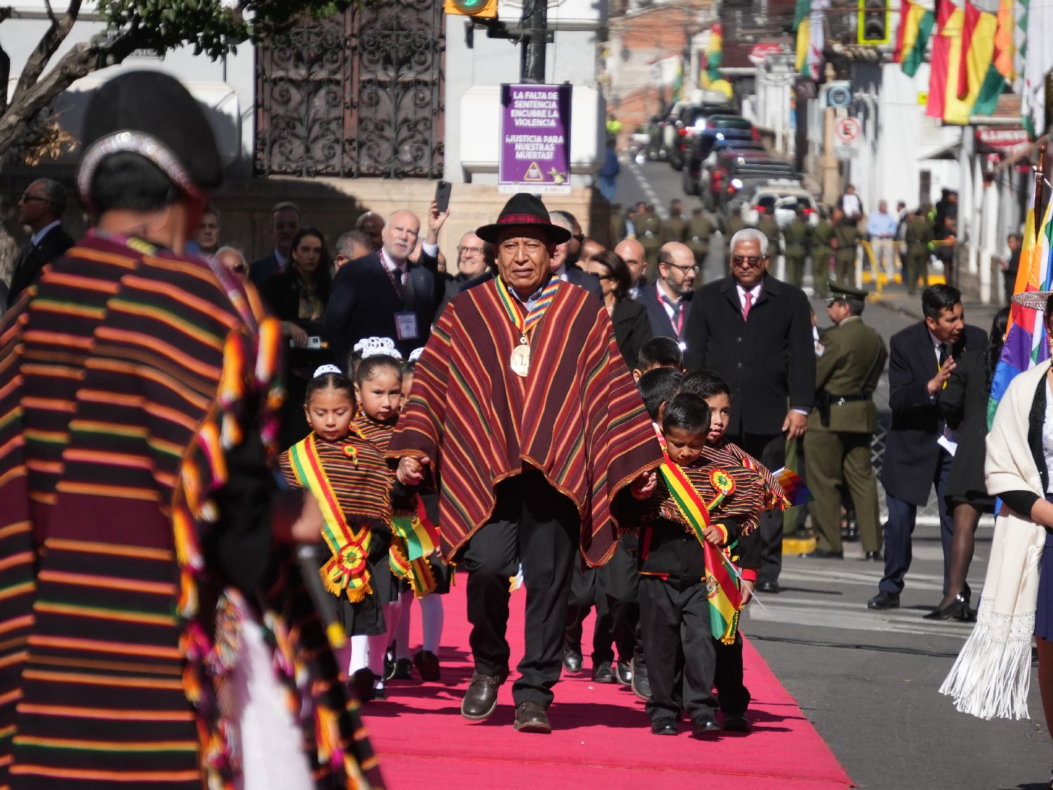 8月6日,玻利维亚副总统乔克万卡(中)在苏克雷参加玻利维亚独立200周年庆典活动。(图片来源:新华社)