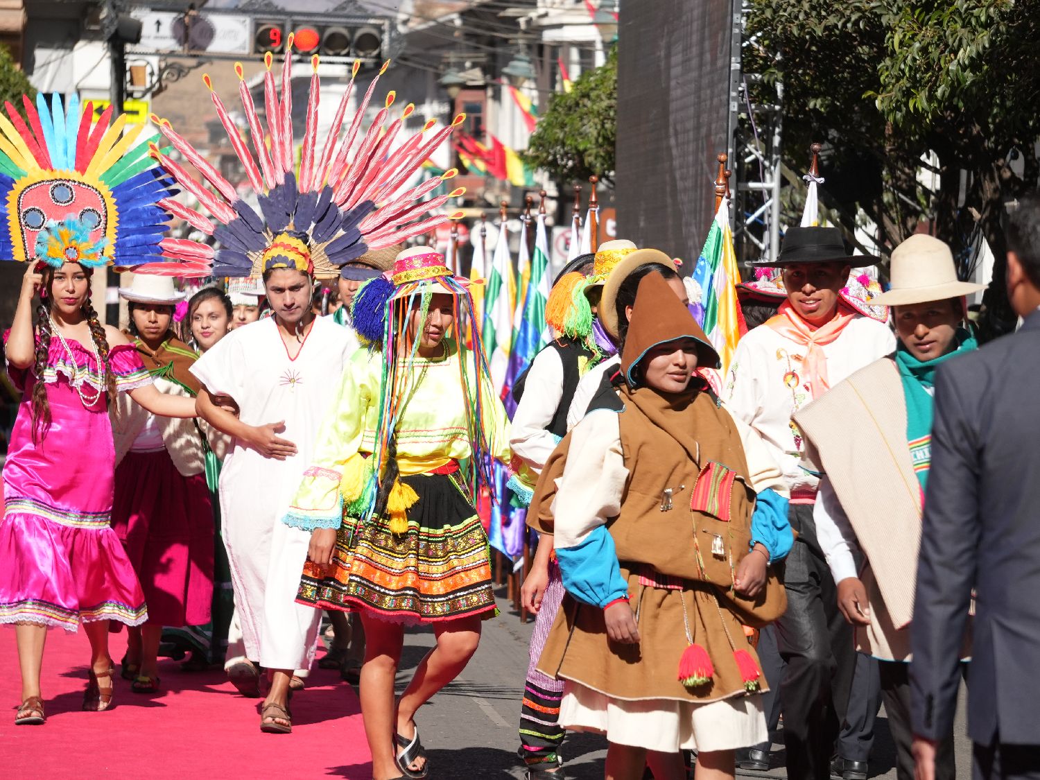 8月6日,在玻利维亚苏克雷,学生身穿象征玻利维亚多元原住民文化的传统服饰参加玻利维亚独立200周年庆典活动。(图片来源:新华社)