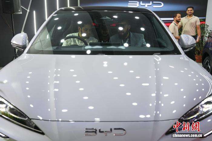 现场展出的比亚迪电动汽车吸引尼泊尔参观者试乘。