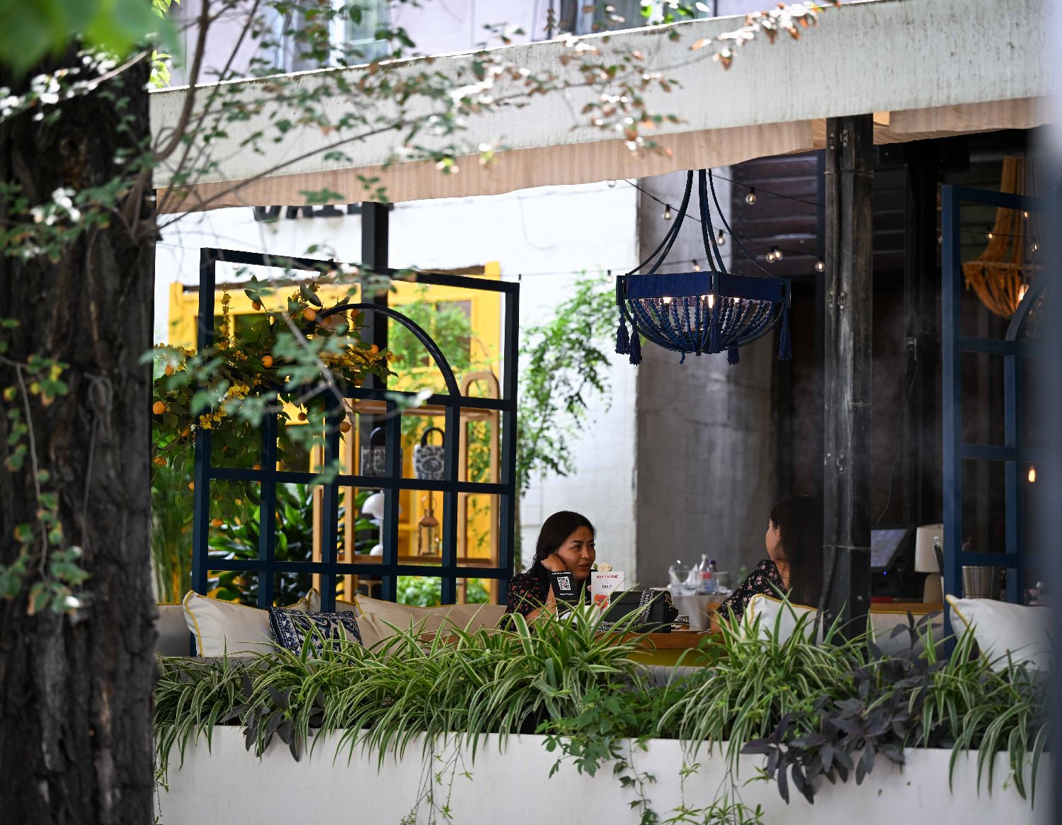 8月3日,在哈萨克斯坦阿拉木图,民众在一家咖啡馆休闲聊天。正值夏日,哈萨克斯坦阿拉木图绿意盎然,景色宜人。(图片来源:本文图片均自新华社)