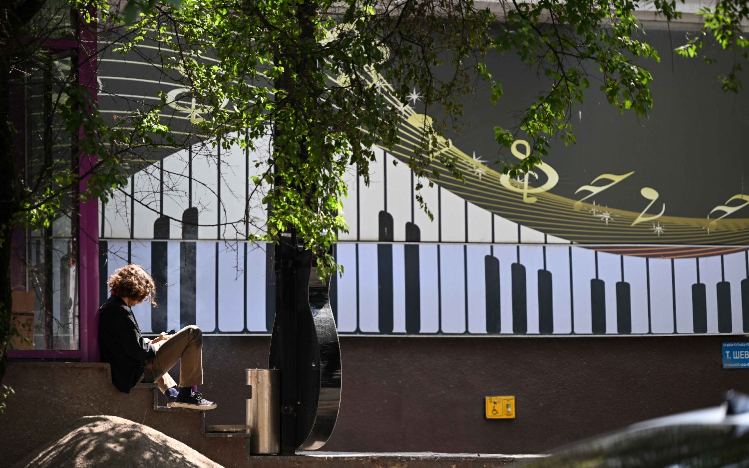 8月3日,在哈萨克斯坦阿拉木图,一名男子在一家商店门前休闲。