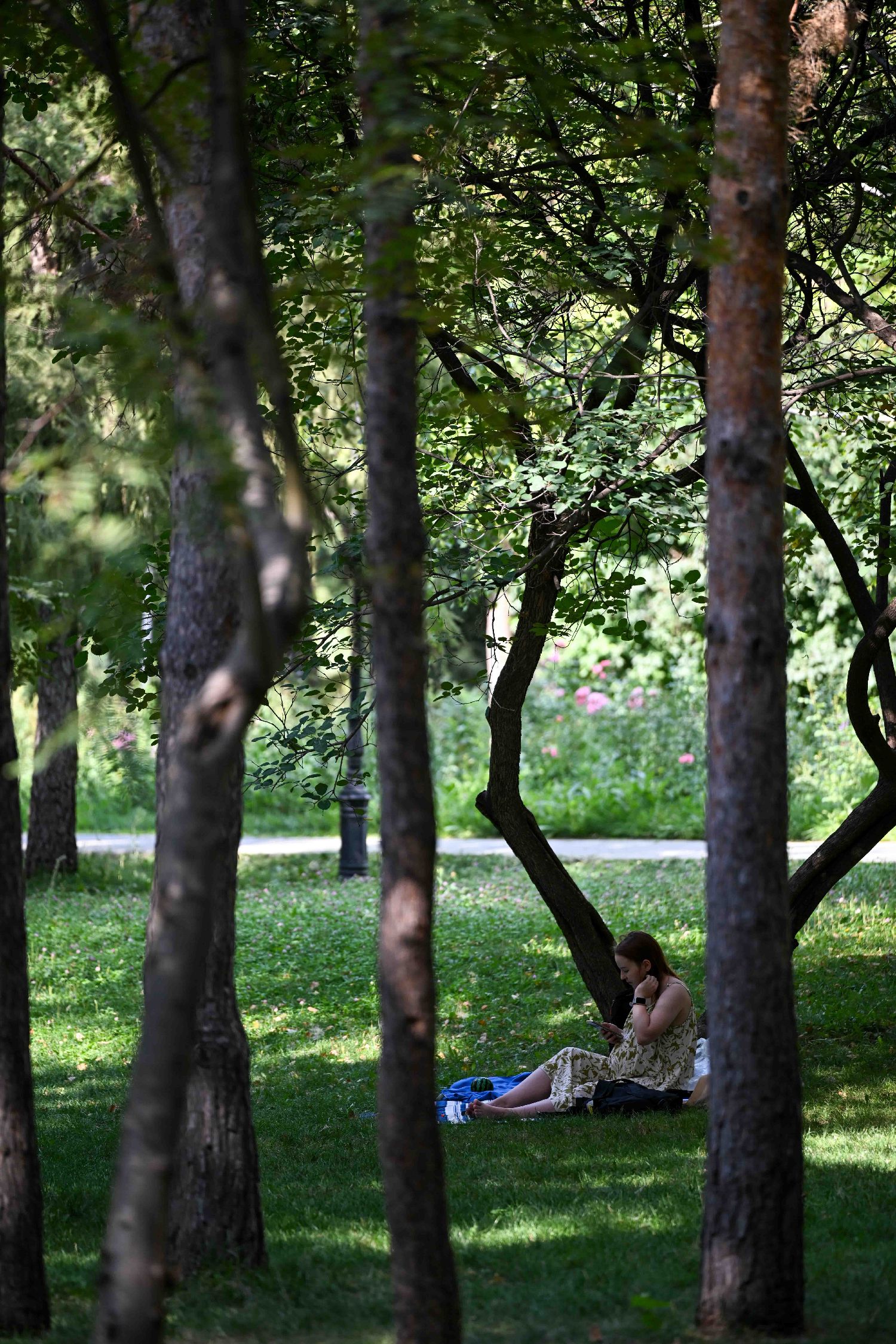 8月3日,在哈萨克斯坦阿拉木图,一名女子在一个公园内休闲纳凉。