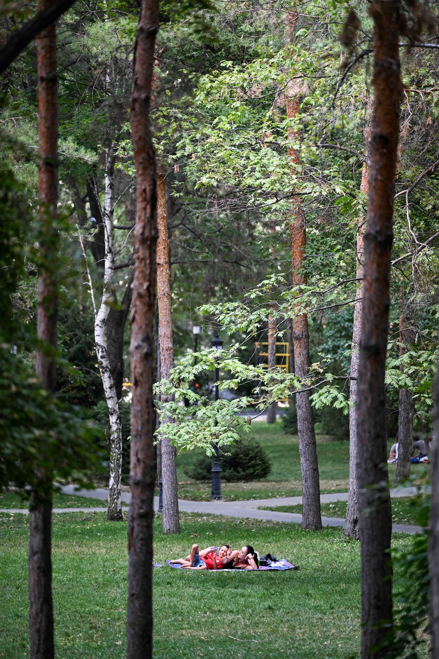 8月3日,在哈萨克斯坦阿拉木图,民众在一个公园内休闲纳凉。