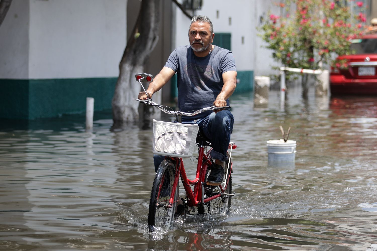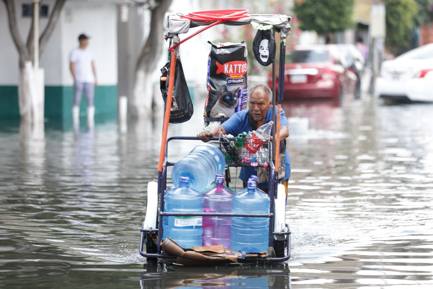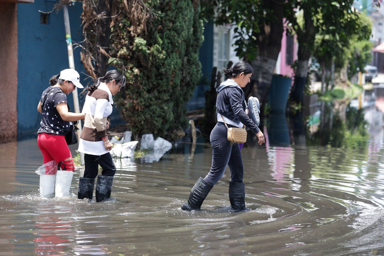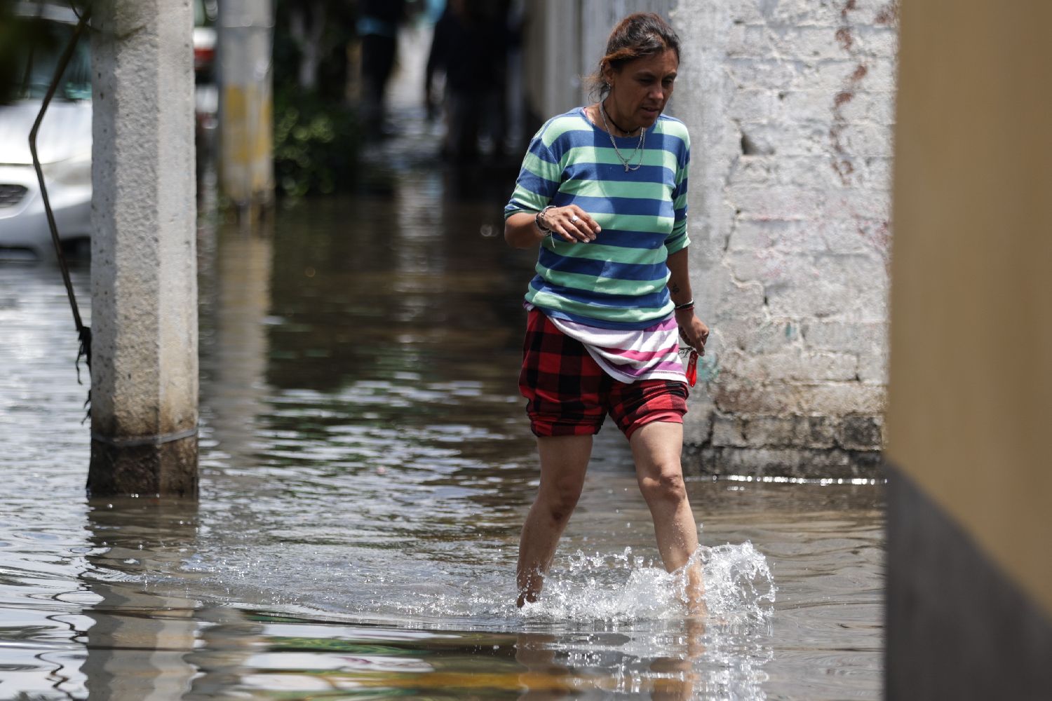 8月12日,在墨西哥首都墨西哥城以东约20公里的内萨瓦尔科约特尔市,受淹街区的居民涉水出行。