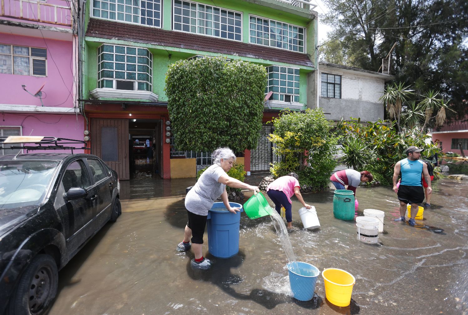 8月12日,在墨西哥首都墨西哥城以东约20公里的内萨瓦尔科约特尔市,受淹街区的居民用水桶排水。