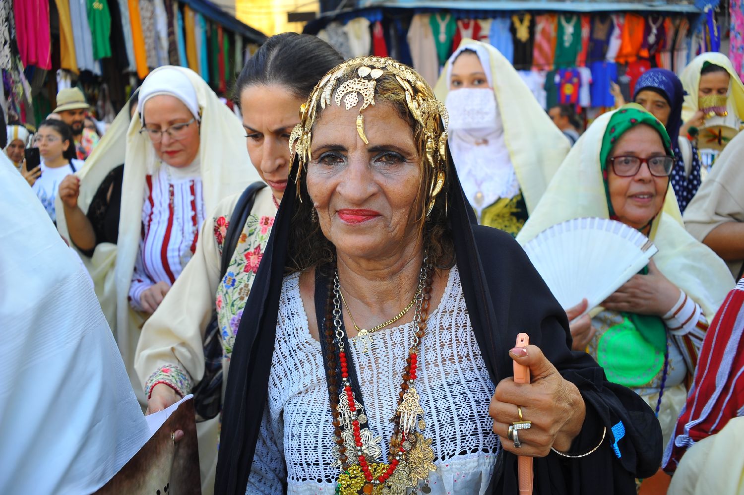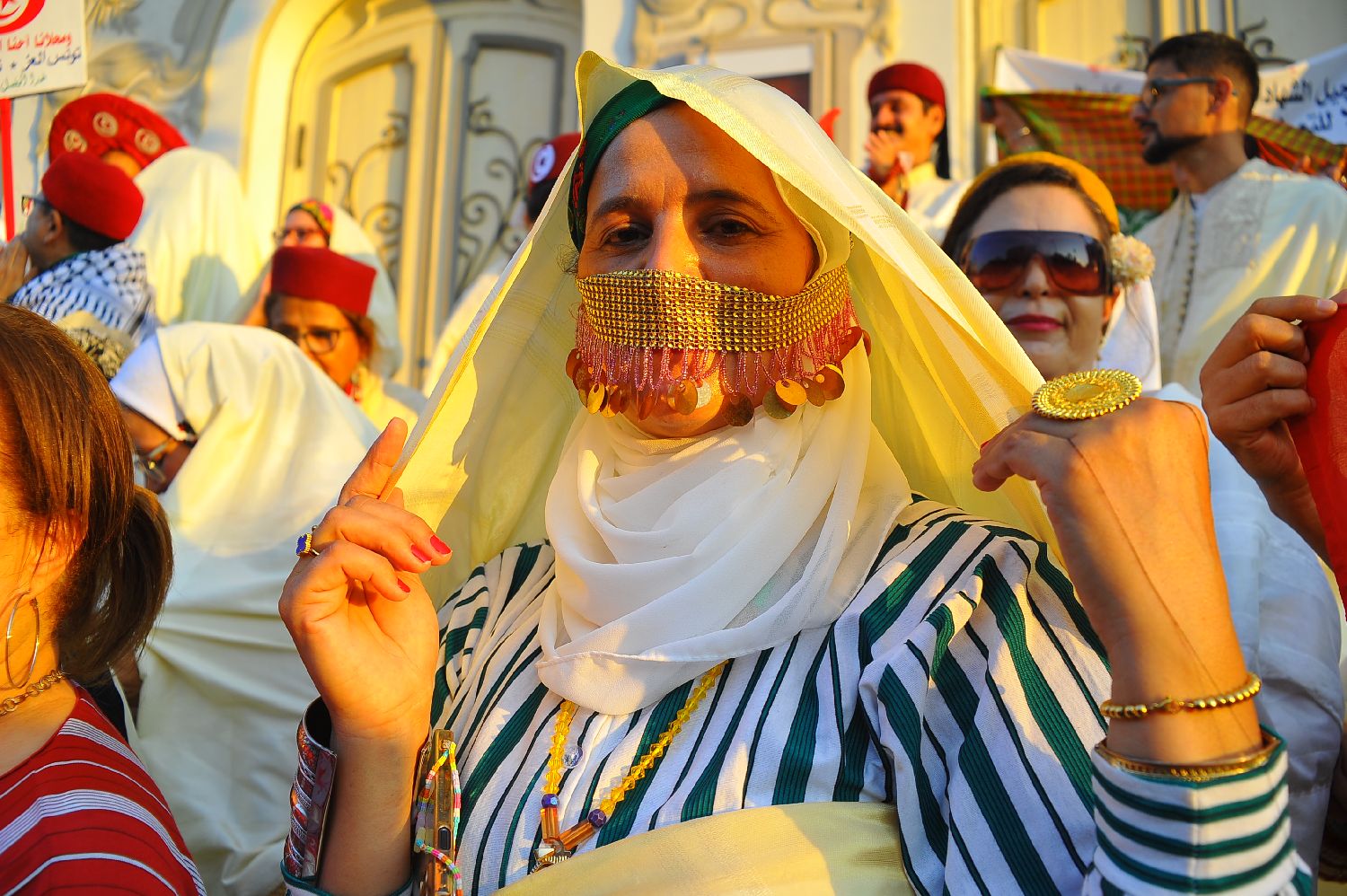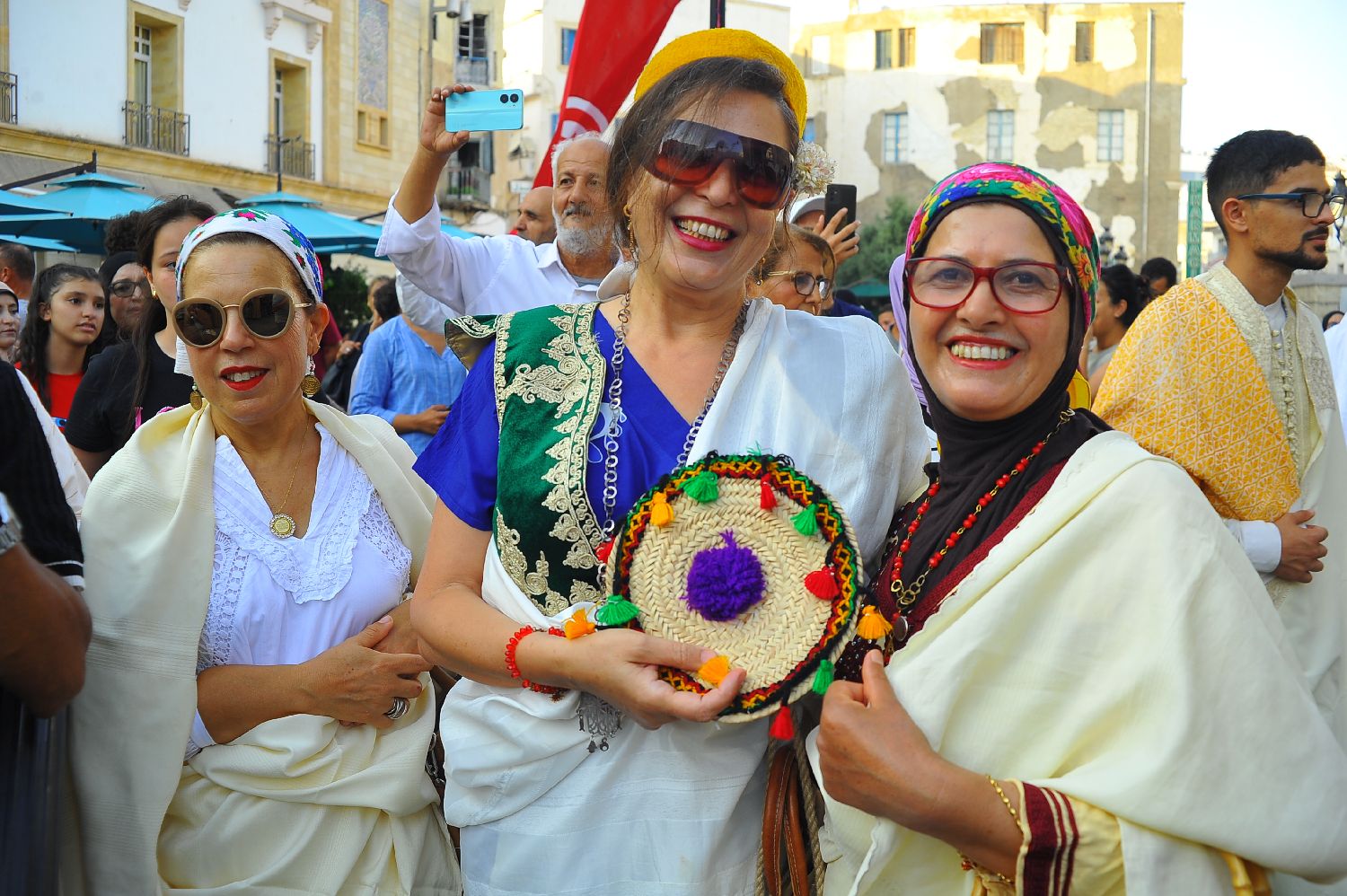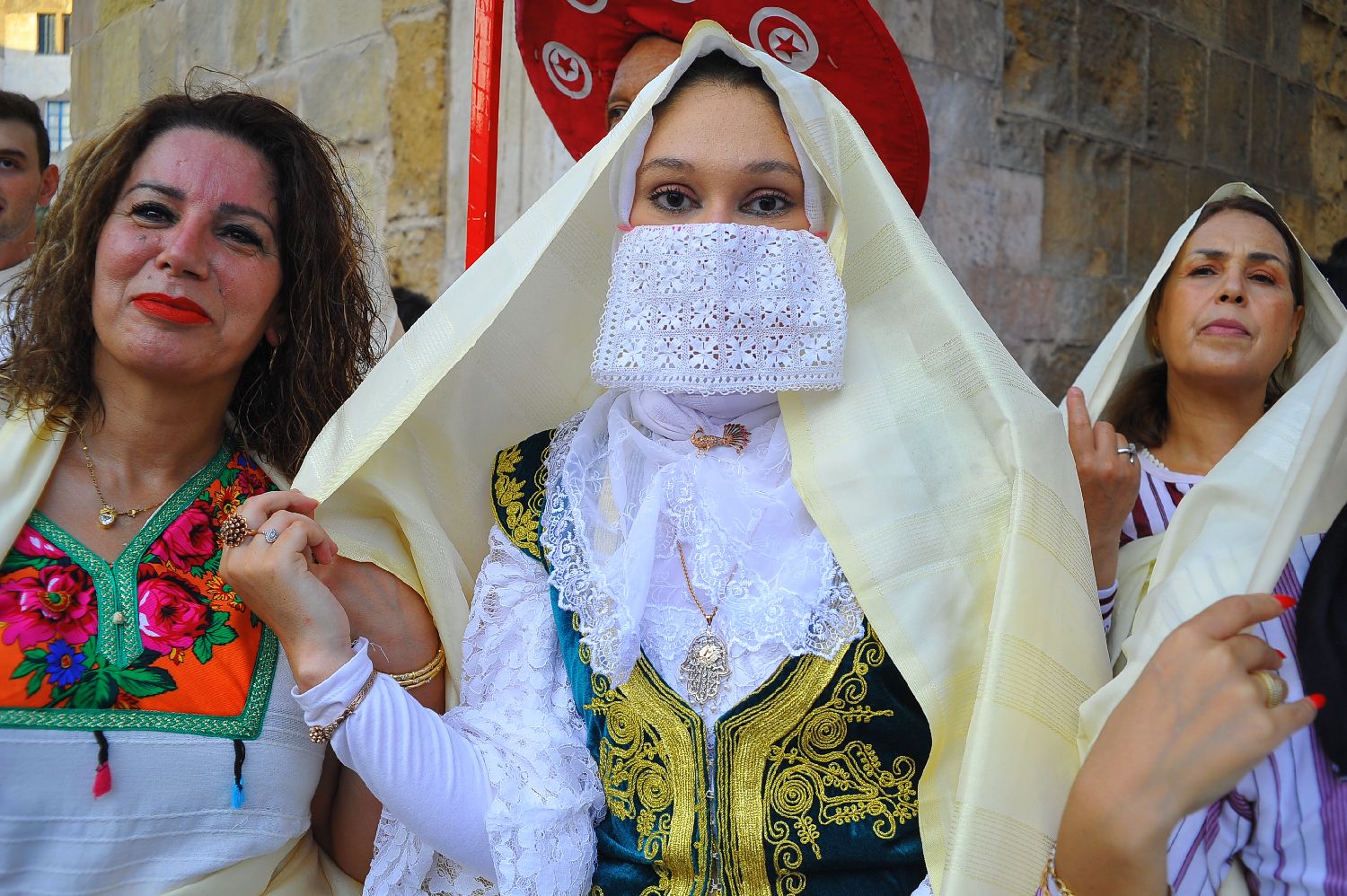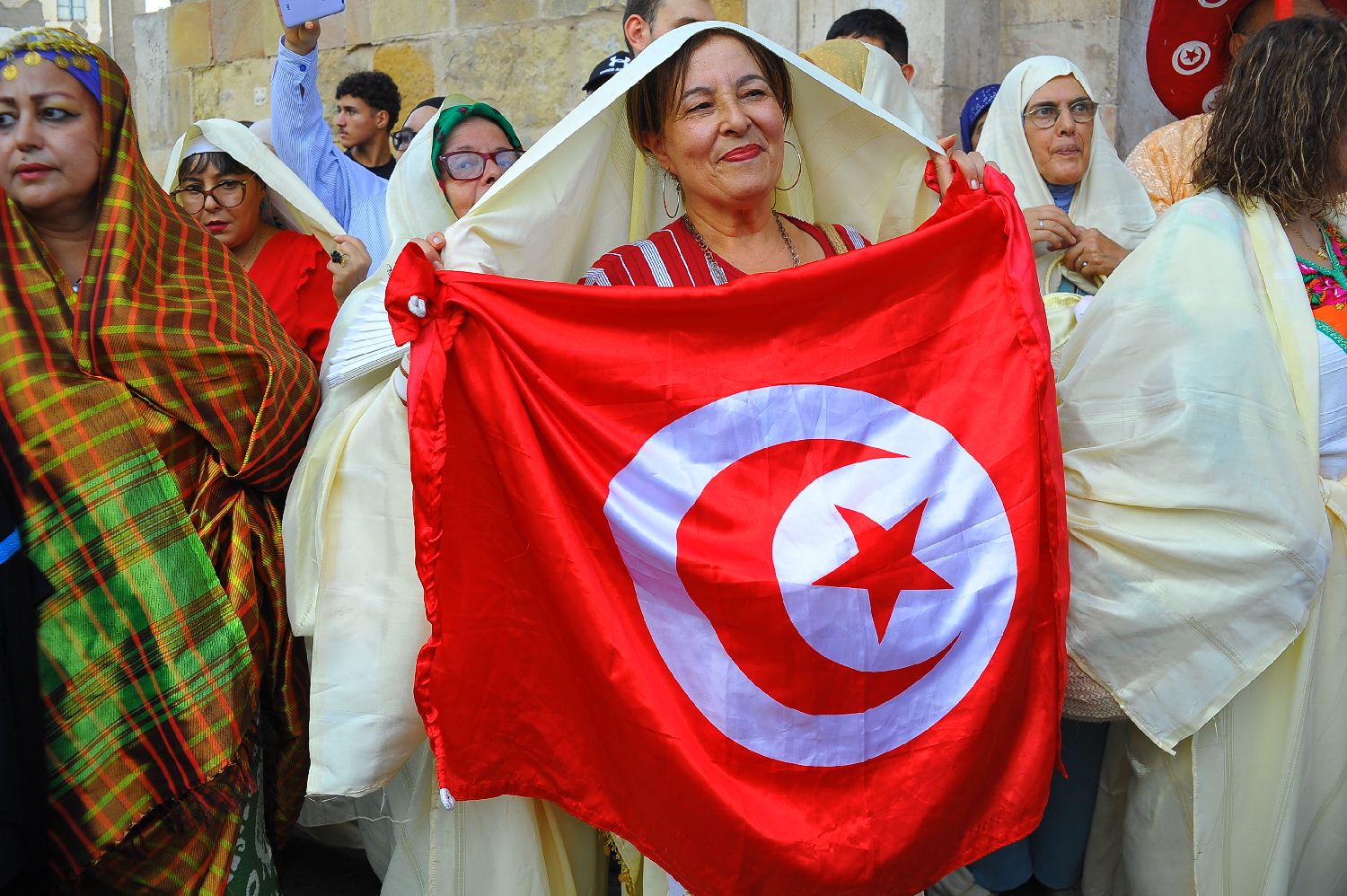 8月13日,在突尼斯首都突尼斯市中心,身着民族服饰的女性庆祝全国妇女节。