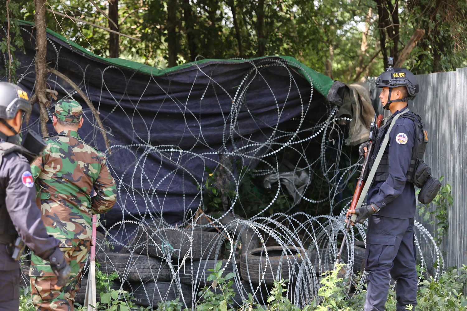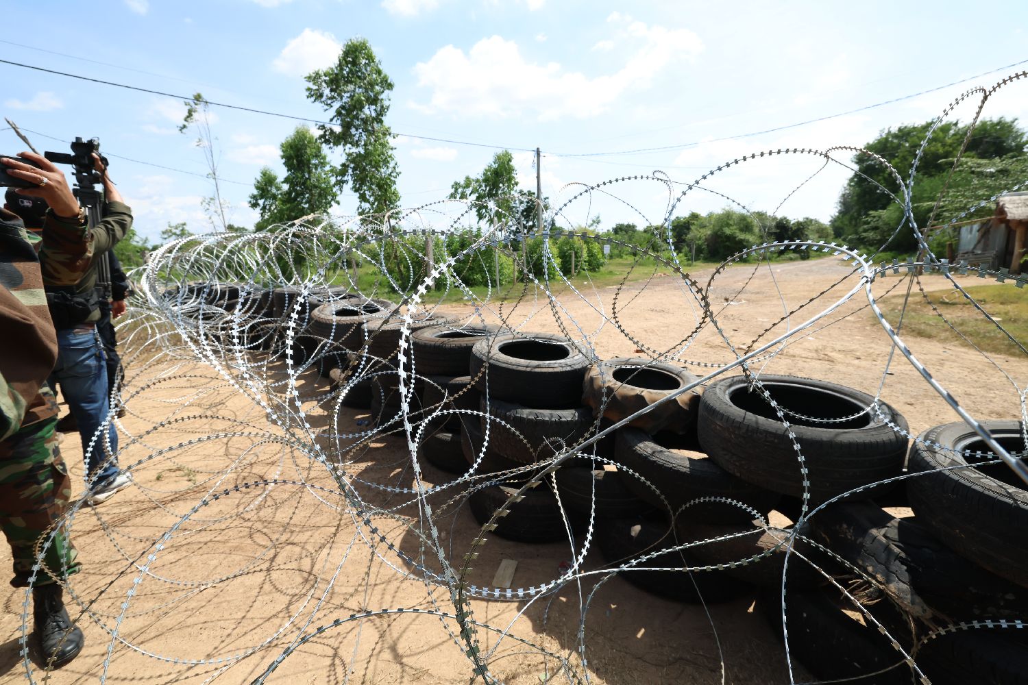 8月14日,在柬埔寨班迭棉吉省一个边境村庄,柬埔寨武装人员在铁丝网和轮胎旁执勤。