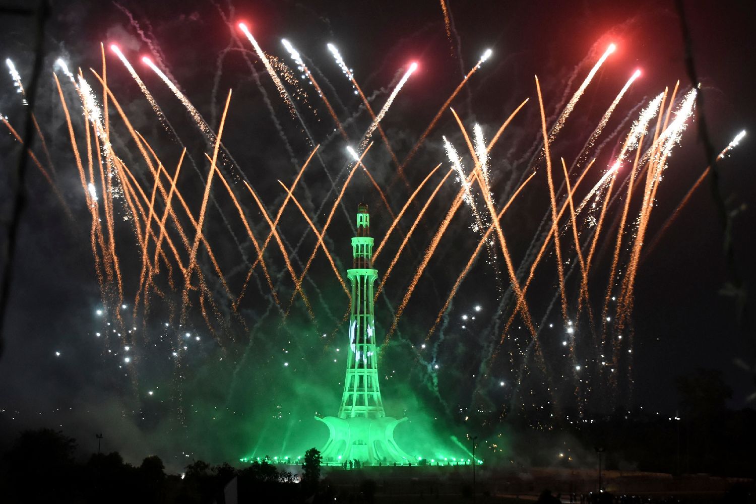 8月14日凌晨,焰火在巴基斯坦旁遮普省首府拉合尔的巴基斯坦塔上空绽放,庆祝巴基斯坦独立日。(图片来源:本文图片均据新华社)