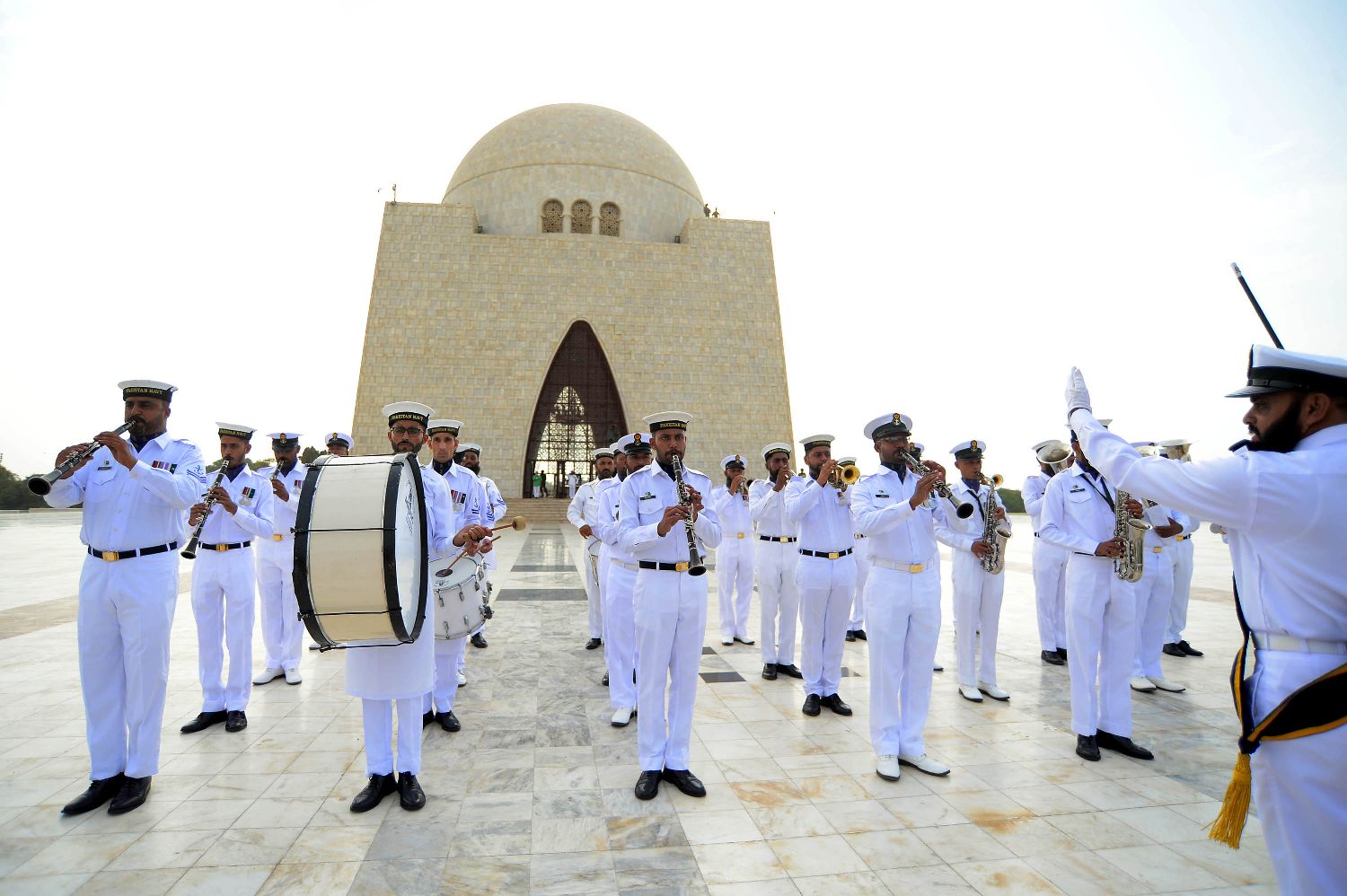 8月14日,在巴基斯坦卡拉奇,军乐团在国父穆罕默德·阿里·真纳的陵墓前举行的巴基斯坦独立78周年庆祝活动上演奏。