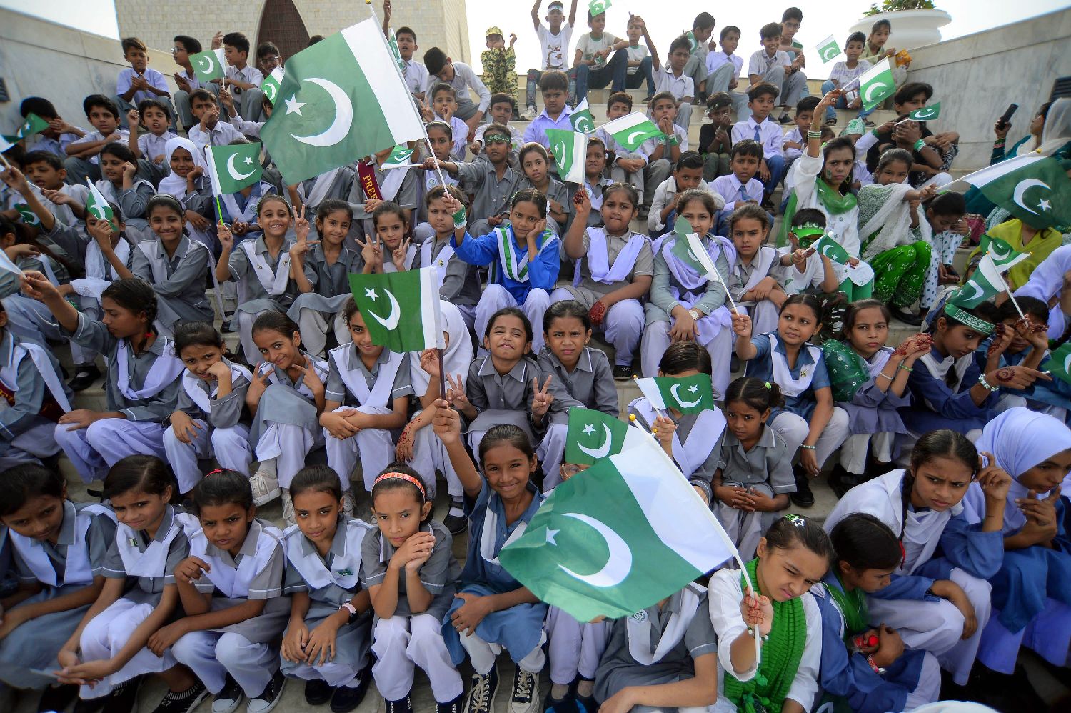 8月14日,在巴基斯坦卡拉奇,当地学生参加巴基斯坦独立78周年庆祝活动。