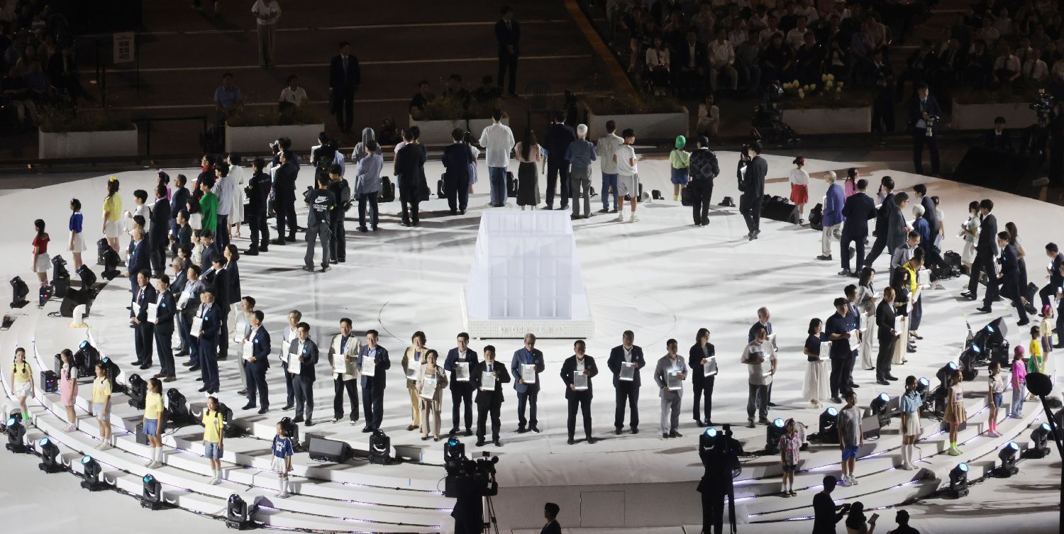 据报道,韩国前总统文在寅及夫人金正淑、已故前总统卢武铉的夫人权良淑,各国驻韩外交使节、各界代表以及预先通过网络报名的约3500名观众参加当天仪式。