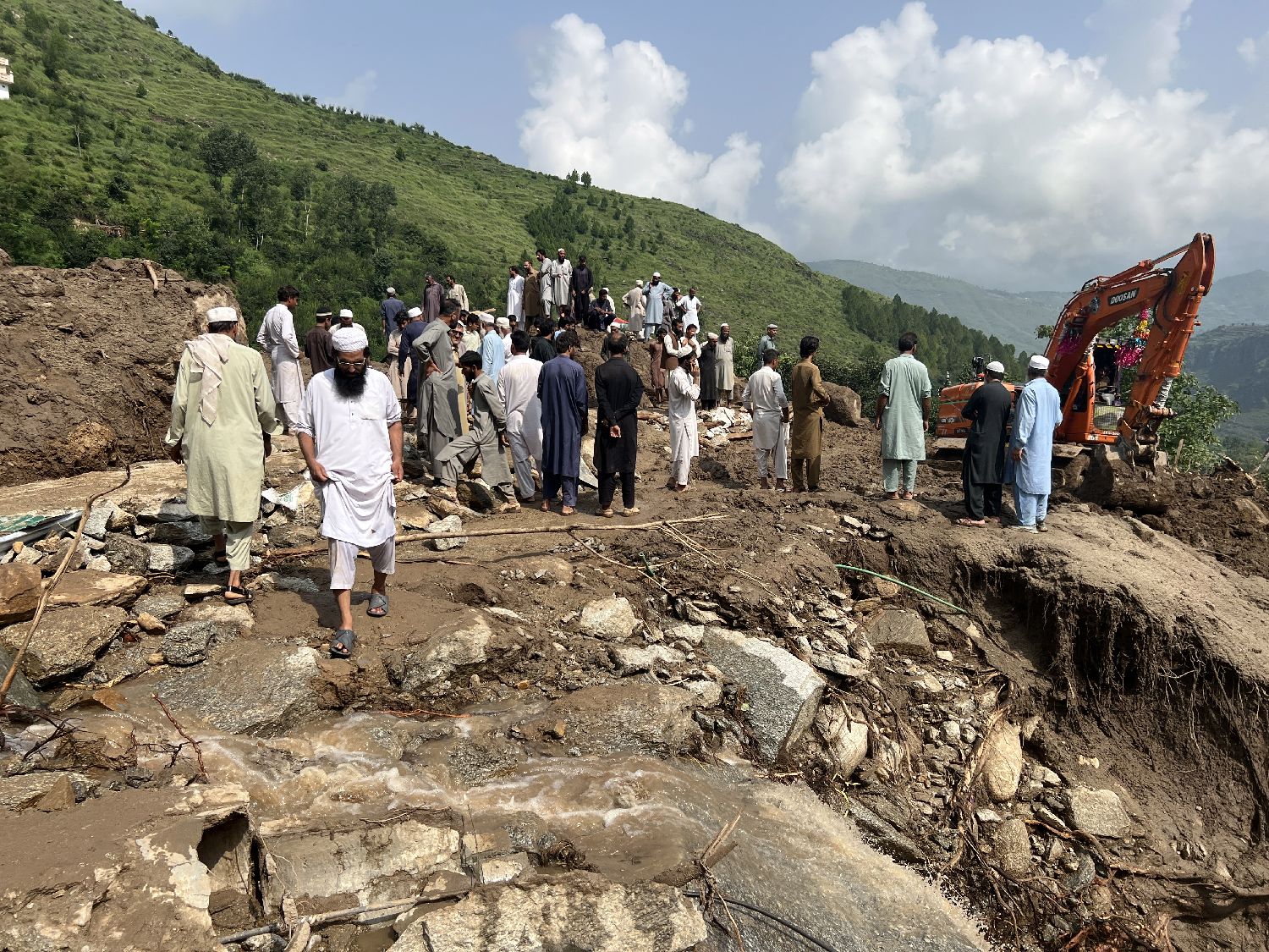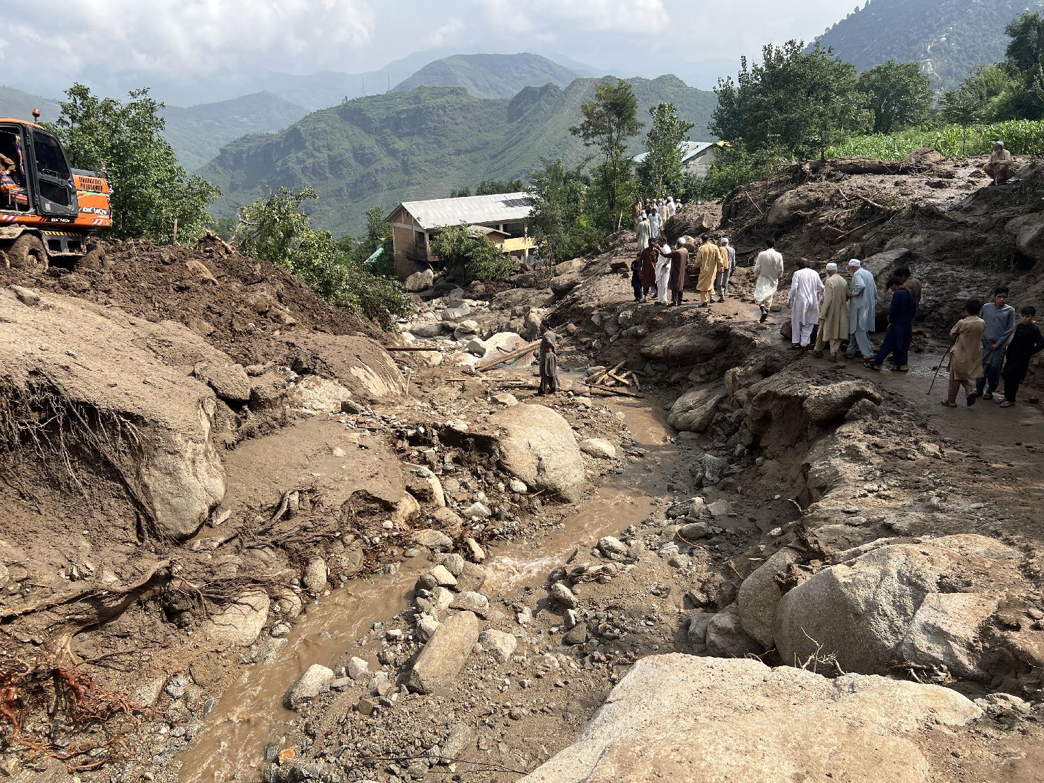 8月16日,在巴基斯坦西北部开伯尔-普什图省布内尔地区,一辆挖掘机正在清除泥浆和废墟。