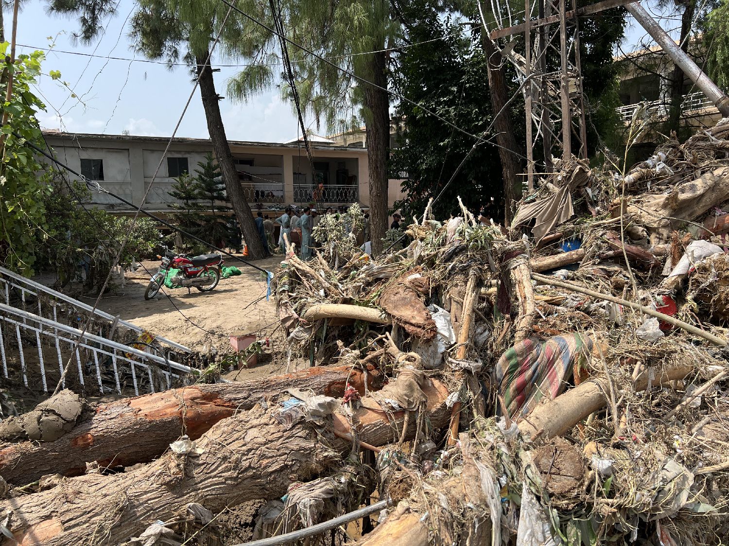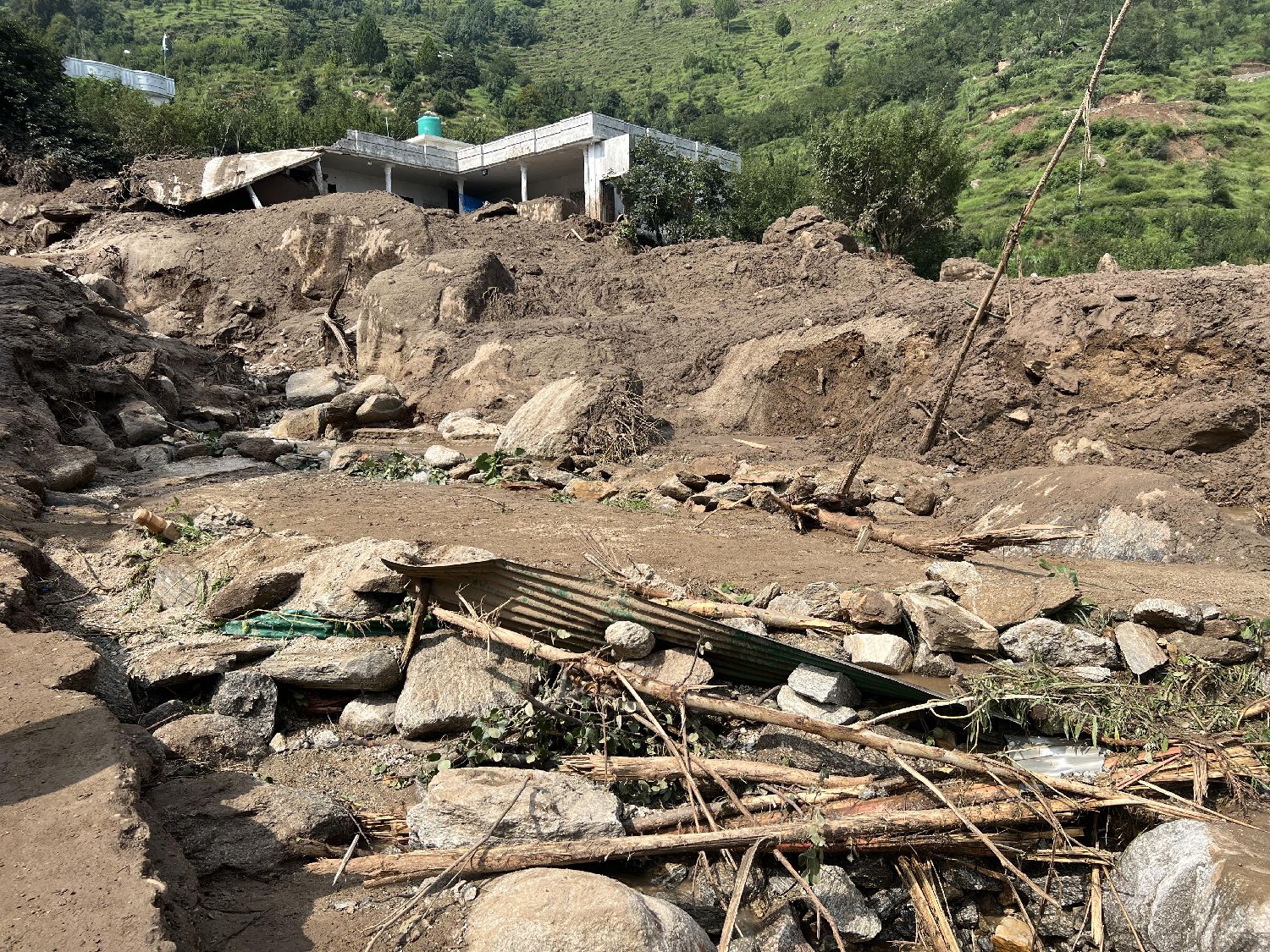 8月16日拍摄的巴基斯坦西北部开伯尔-普什图省布内尔地区洪水过后的房屋废墟。