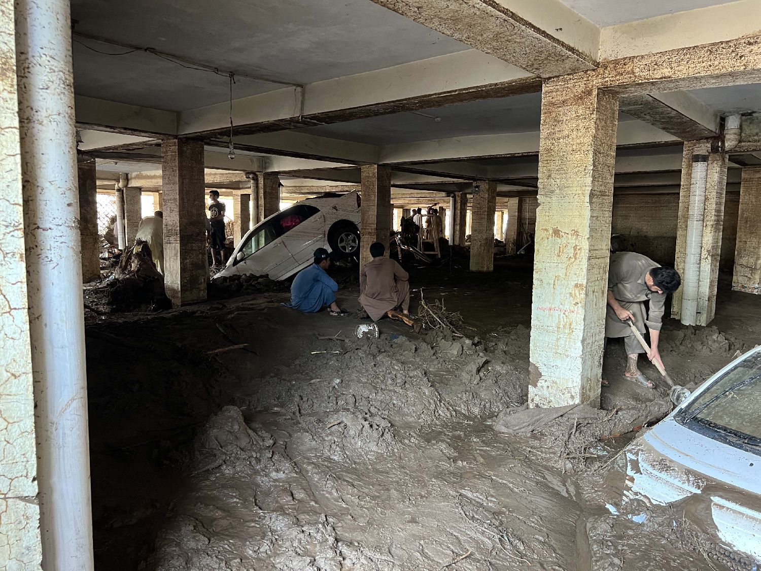 8月16日,在巴基斯坦西北部开伯尔-普什图省布内尔地区,人们努力从泥浆和废墟中挖出车辆。
