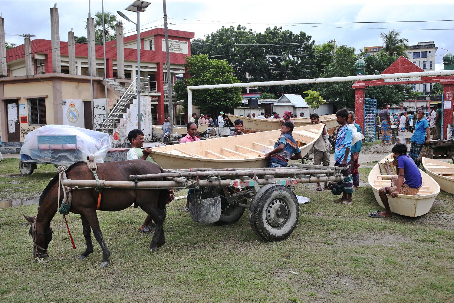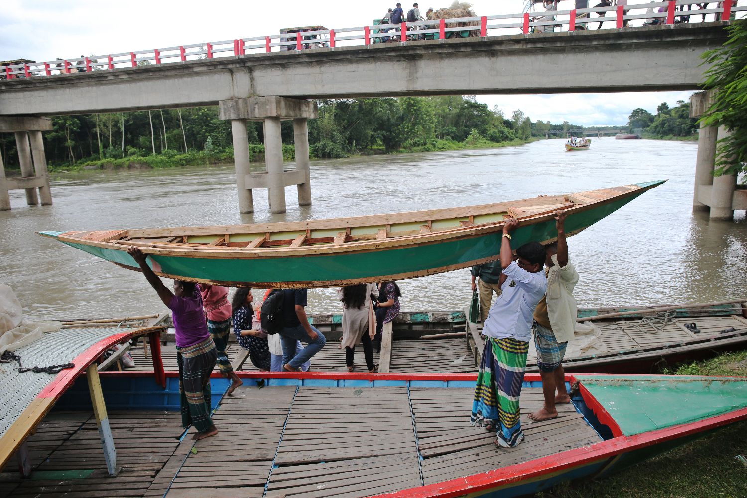 8月20日,在孟加拉国马尼格甘杰的传统手工木船市场,民众运送售出的木船。