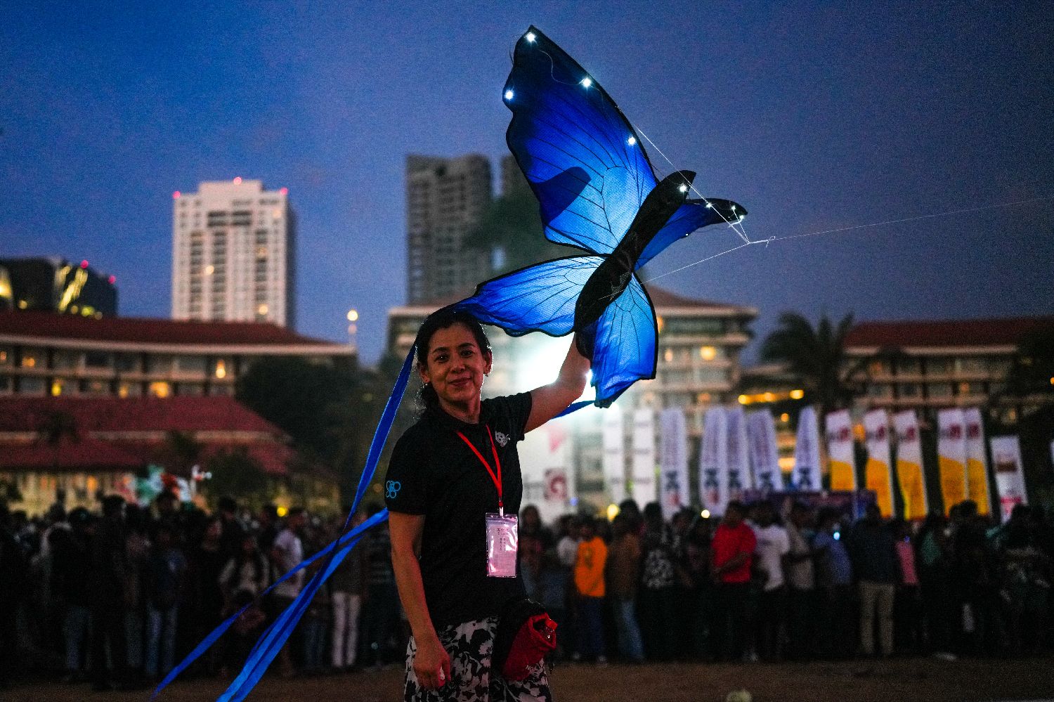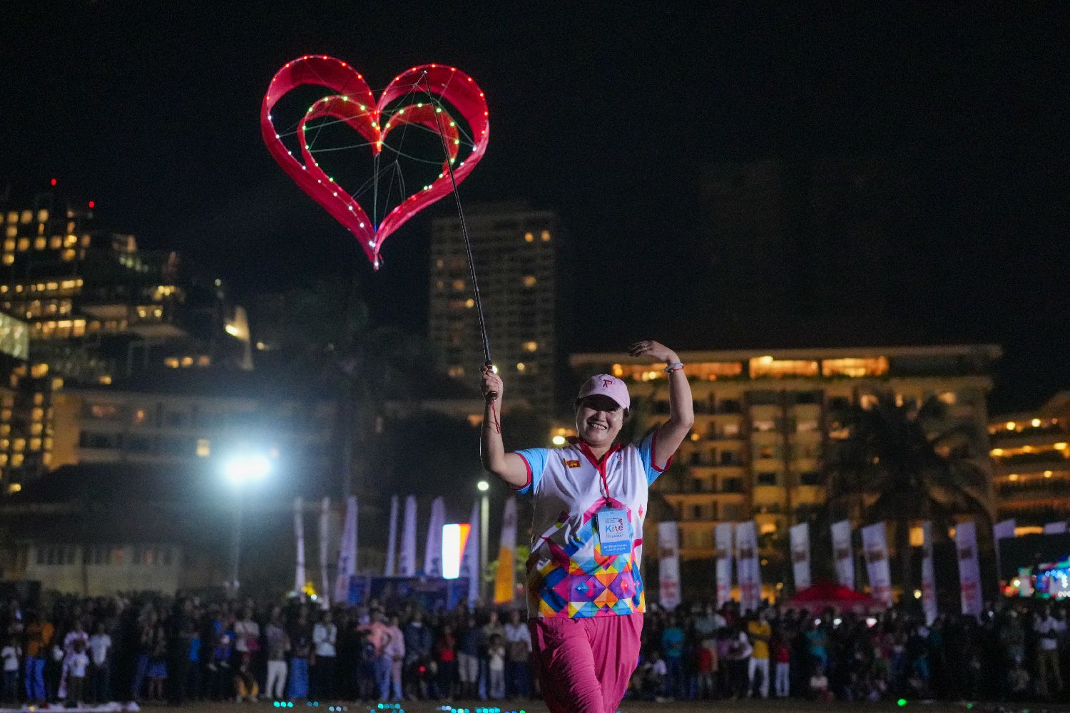 8月24日,在斯里兰卡科伦坡,参赛者放飞灯光风筝。