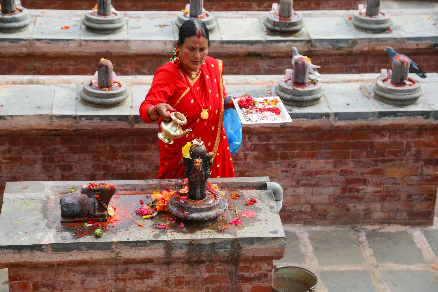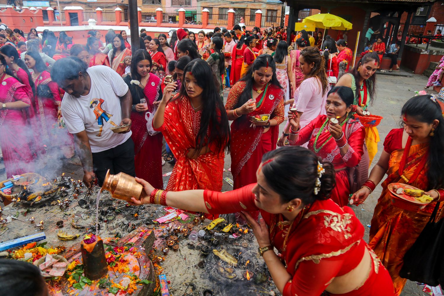 尼泊尔女性通常在这一天身穿红色纱丽前往当地的庙宇,以唱歌、跳舞、点灯祈福及斋戒(通常滴水不进)的形式祈福,祈愿生活幸福美满。图为8月26日,在尼泊尔加德满都谷地城市勒利德布尔,身着红色纱丽的女性在当地一座庙宇中祈福。(图片来源:本文图片均据中新社)