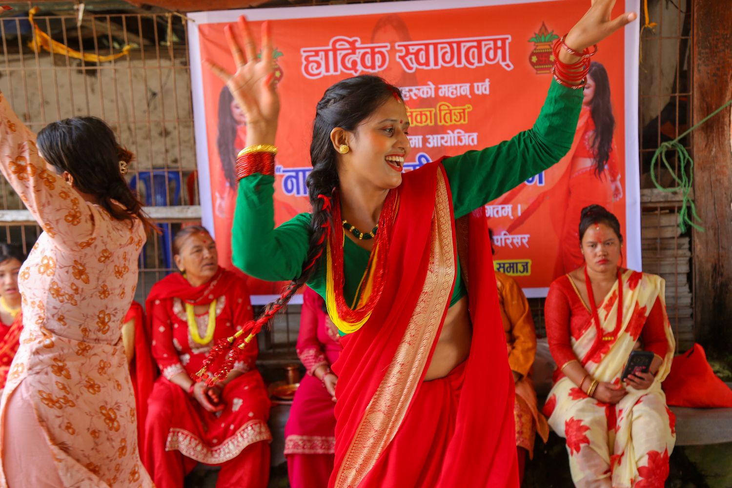 8月26日,在尼泊尔加德满都谷地城市勒利德布尔,身着艳丽纱丽的女子载歌载舞。
