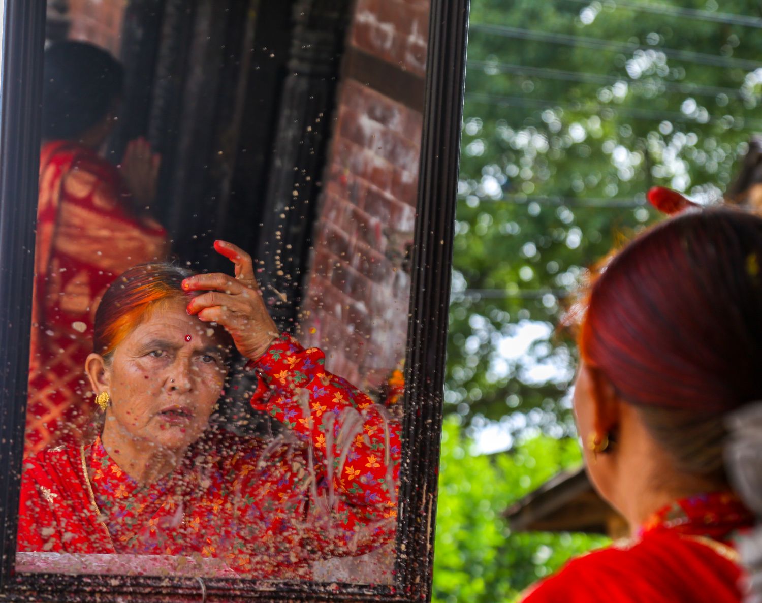 8月26日,在尼泊尔加德满都谷地城市勒利德布尔,身着红色纱丽的妇人对镜整理妆容。