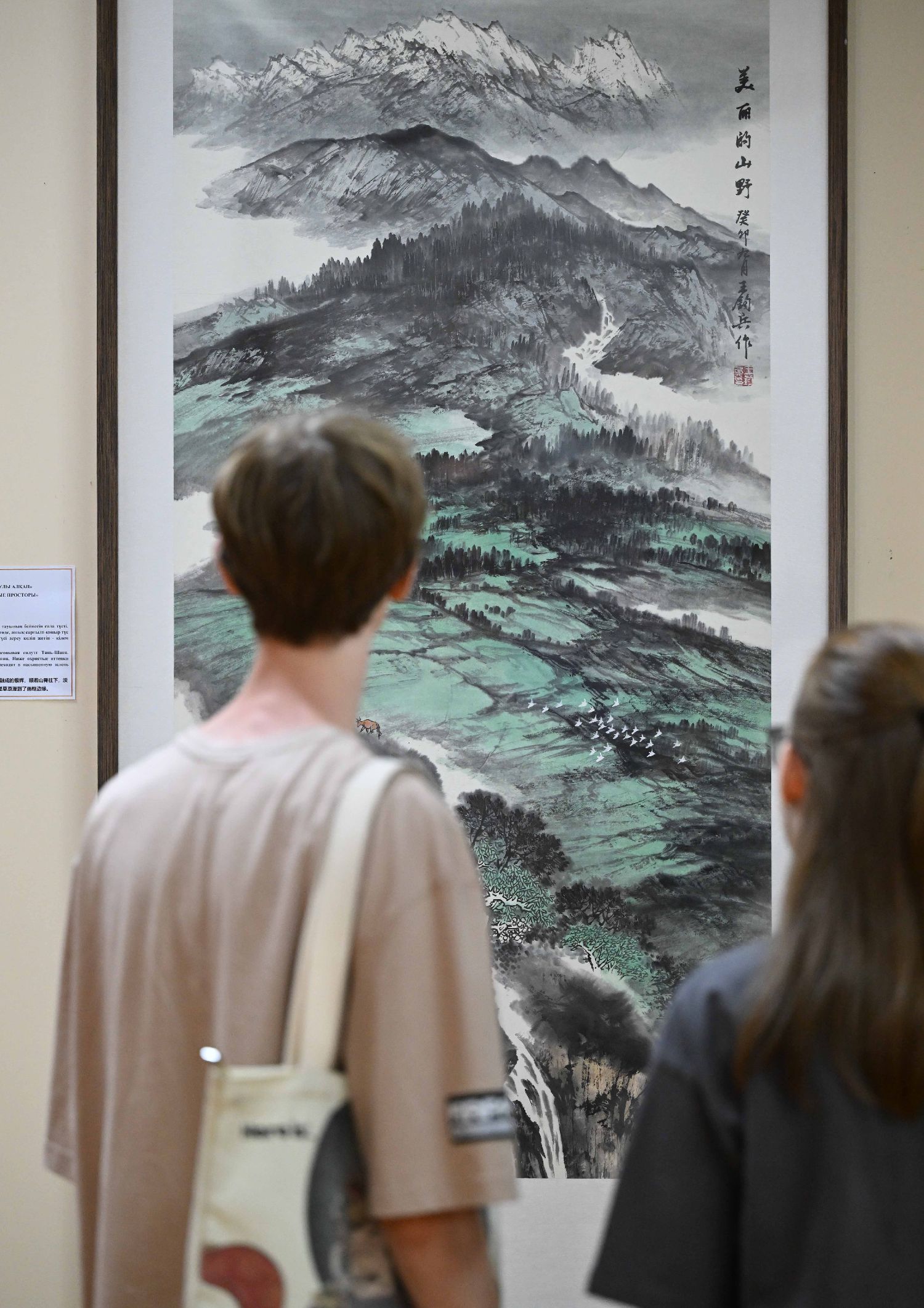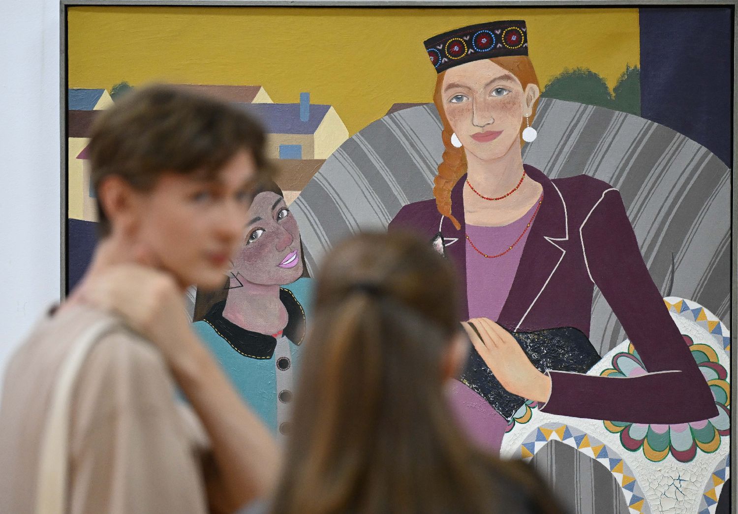 8月27日,在位于阿拉木图的哈萨克斯坦中央国家博物馆,观众在“精彩中国 艺美新疆”美术摄影展上参观。(图片来源:本文图片均据新华社)
