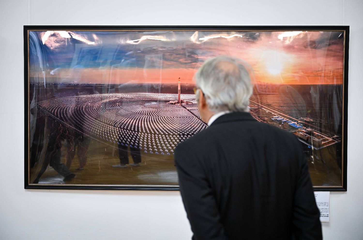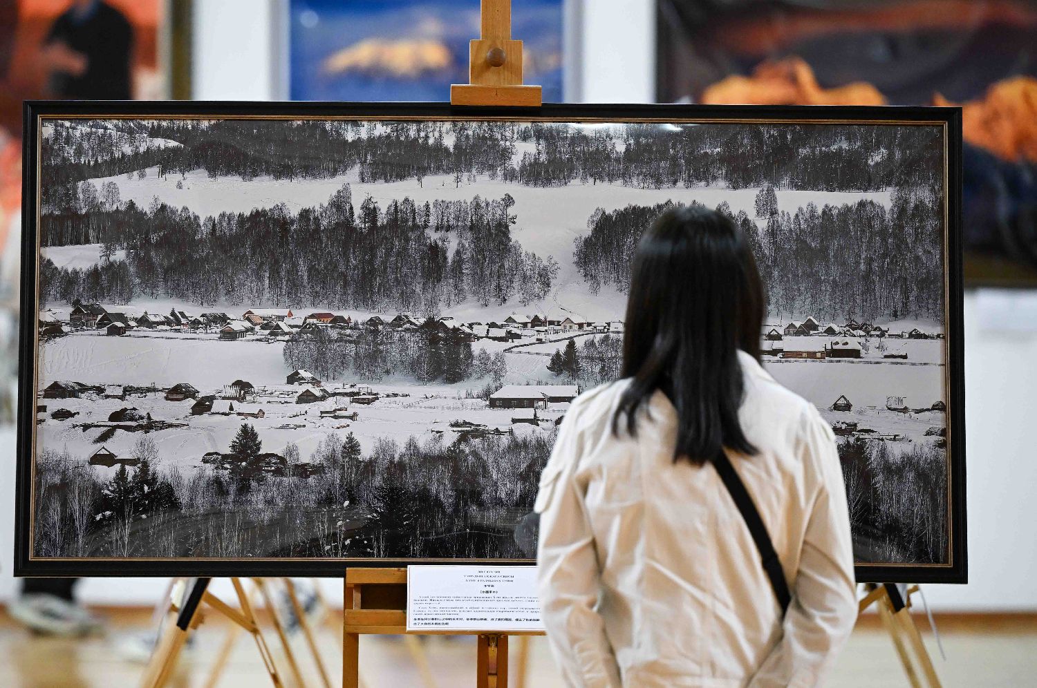8月27日,在位于阿拉木图的哈萨克斯坦中央国家博物馆,观众在“精彩中国 艺美新疆”美术摄影展上拍照。
