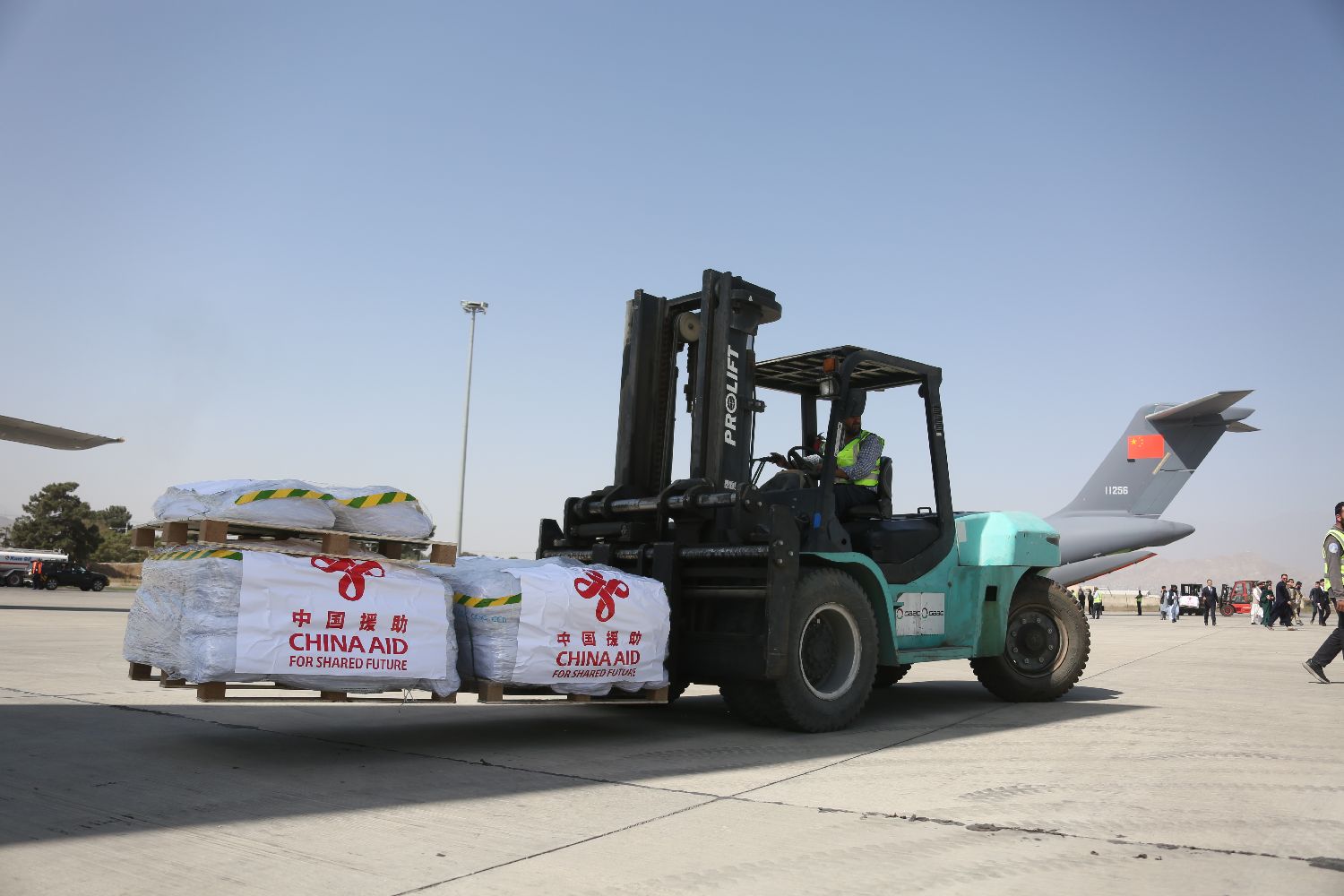 工作人员运送从中国空军运-20飞机上卸载的援助阿富汗救灾物资。