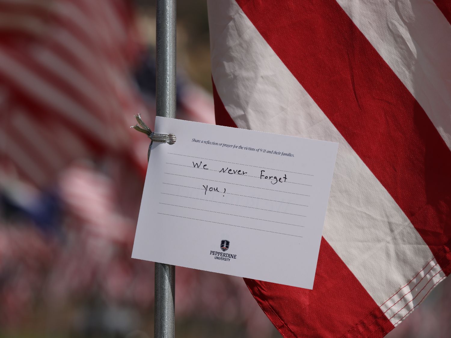 9月10日在美国加利福尼亚州洛杉矶县马利布佩珀代因大学拍摄的“旗海”中的悼念留言卡片。